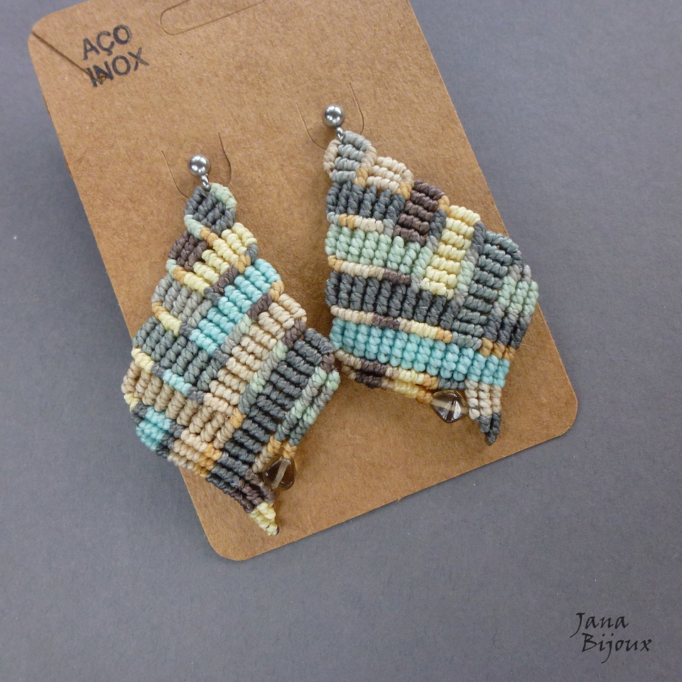 Brincos de macramé cores frios pasteis, cada um com mesmas cores porém com outra sequencia de distribução. Vidro na ponta marrom discreto. .. fecho de aço inox. Comprimento 6,5 cm R$ 38,00