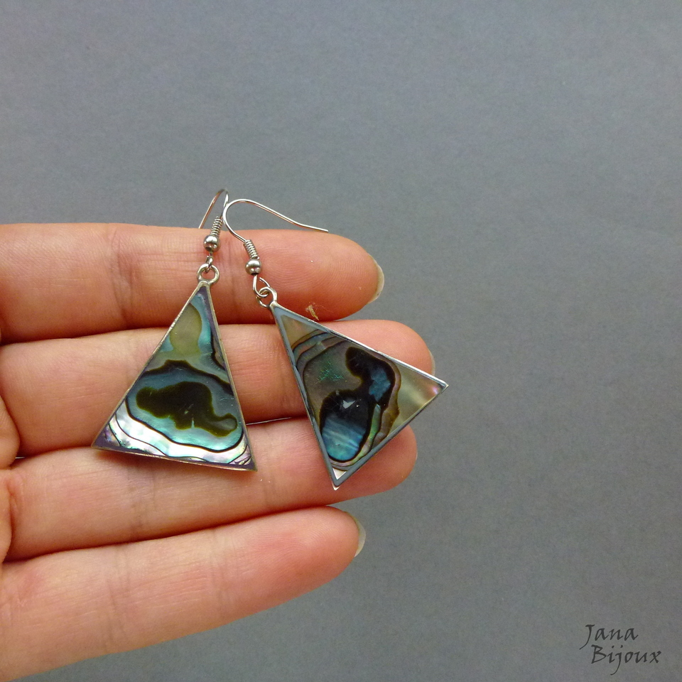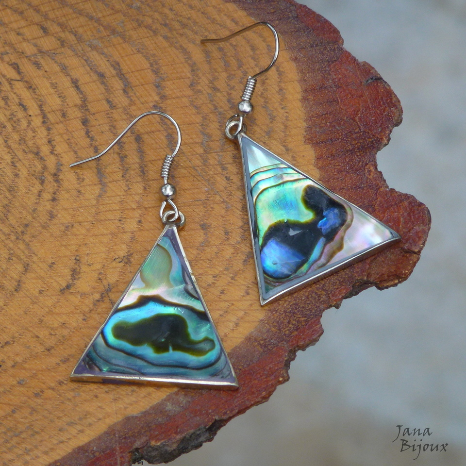 Brincos compridos 4,7 cm de alpaca com fecho de aço inox, abalone R$ 26,00.