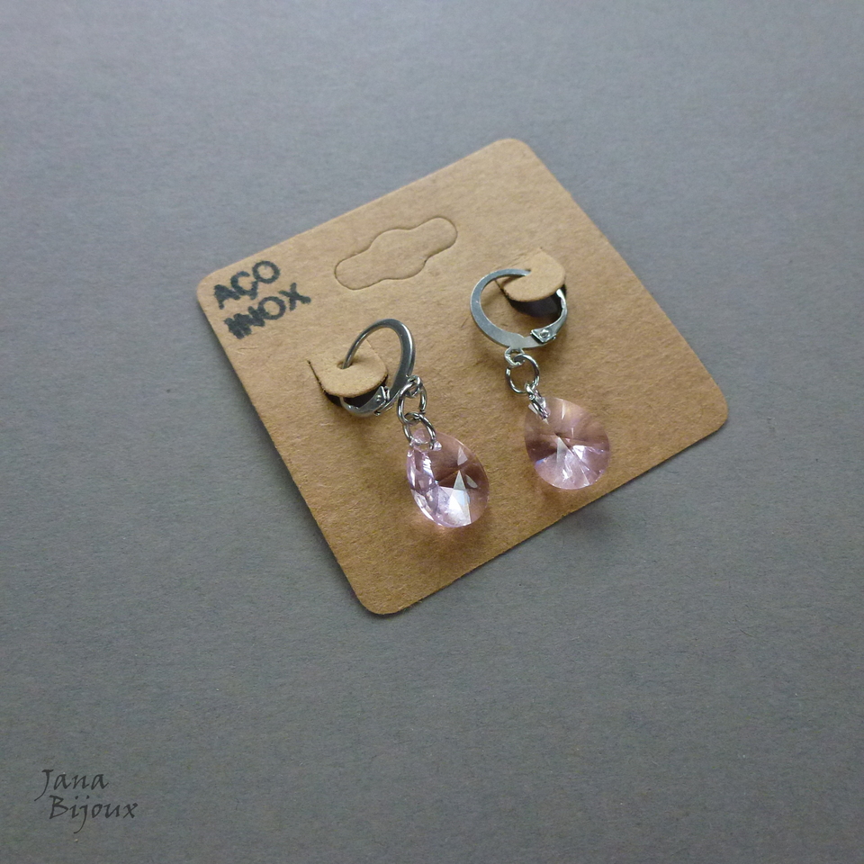 Brincos leves, com aço inox, moderno, com lindas gotas ROSALINE de Swarovski cristais..12 mm. ( = rosa claro transparente)