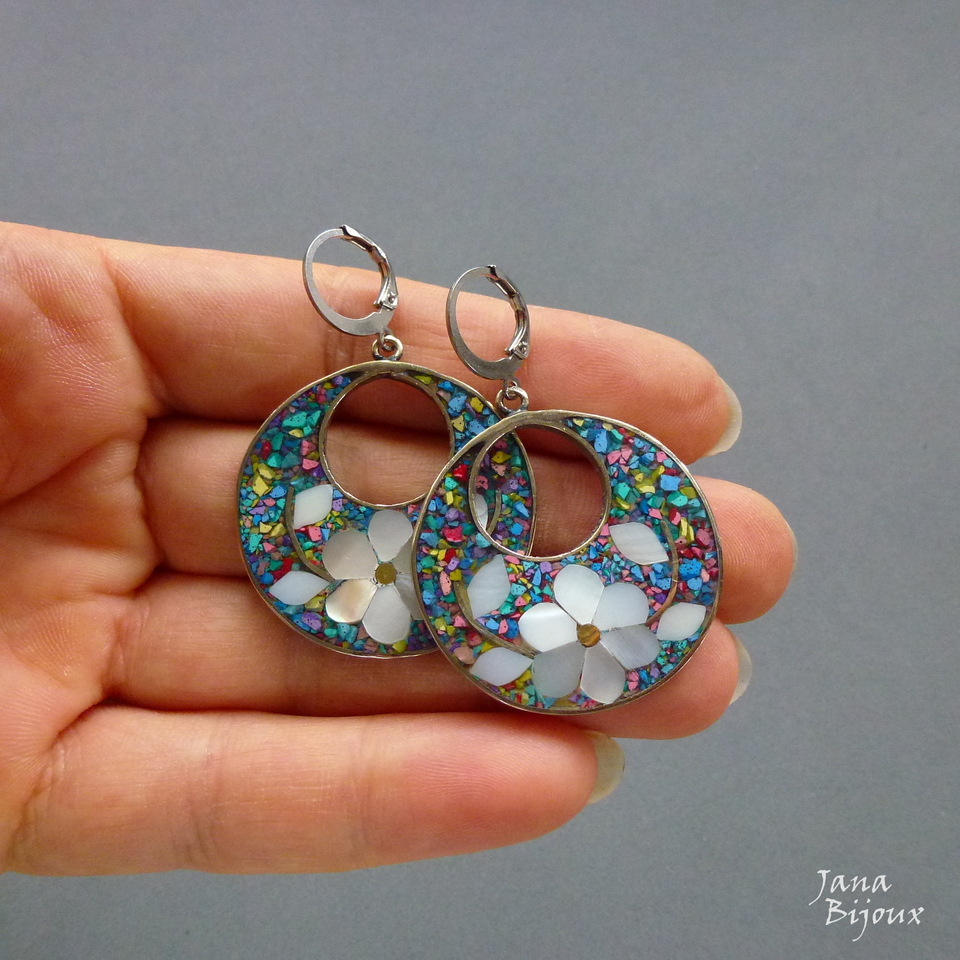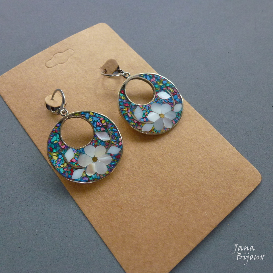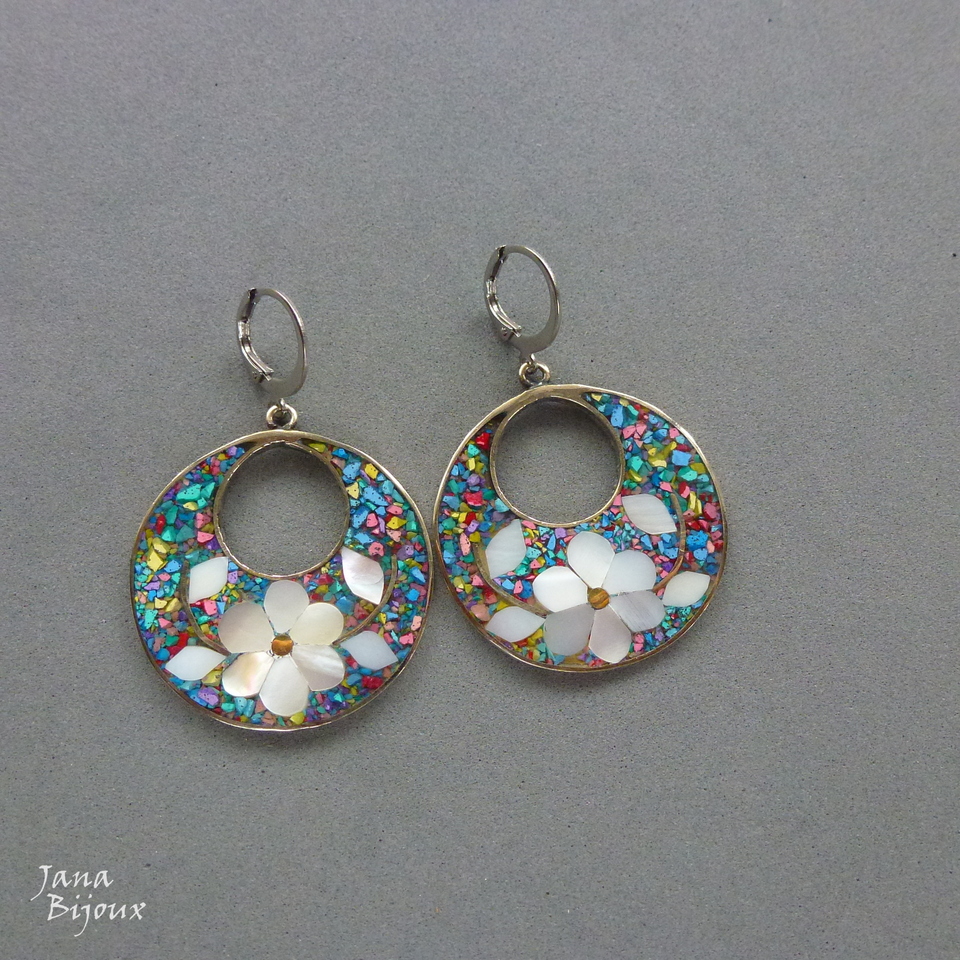 Aç445 09/12/2018VENDIDOS ( Prodáno)Jana Bijoux Brincos compridos 4,7cm de alpaca com fecho de aço inox, formato argola, madrepérola e abalone, colorido. R$ 33,00