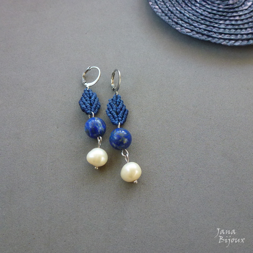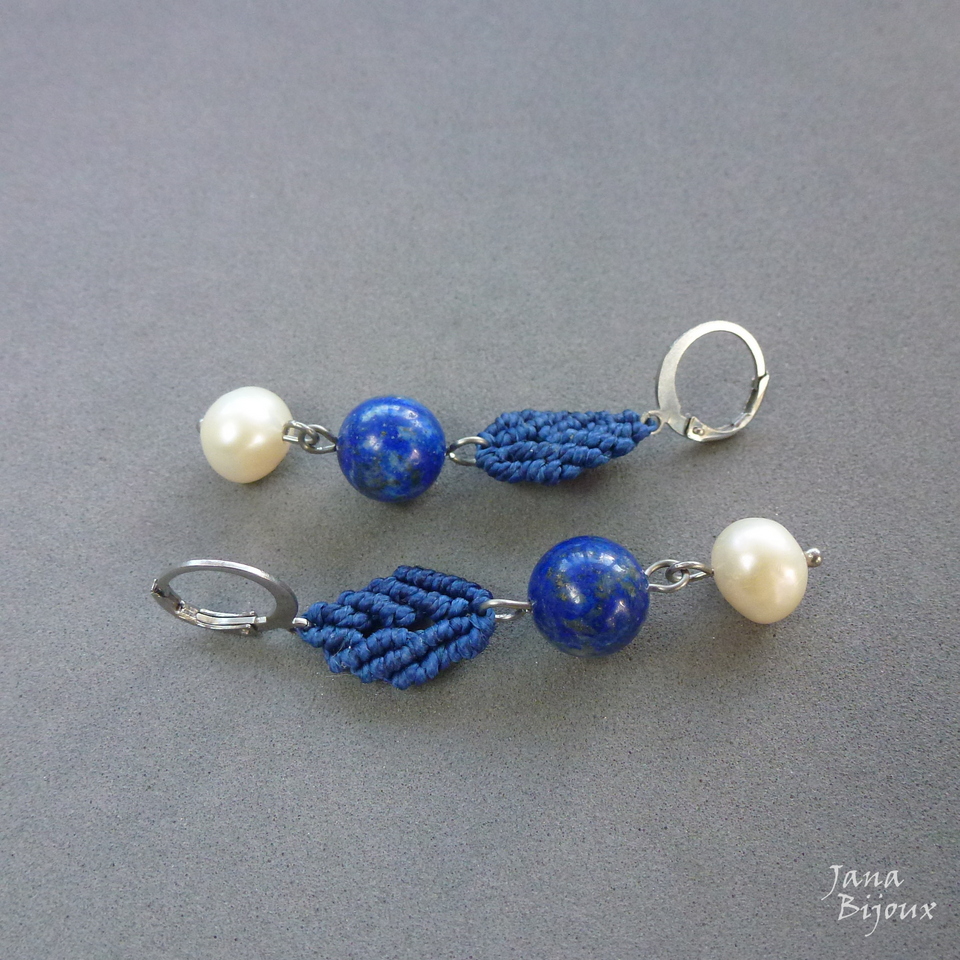 Brincos delicados de macramé, em formato de folha, com bolas de lapis lazuli e pérolas. Fecho de aço inox, comprimento 6 cm.