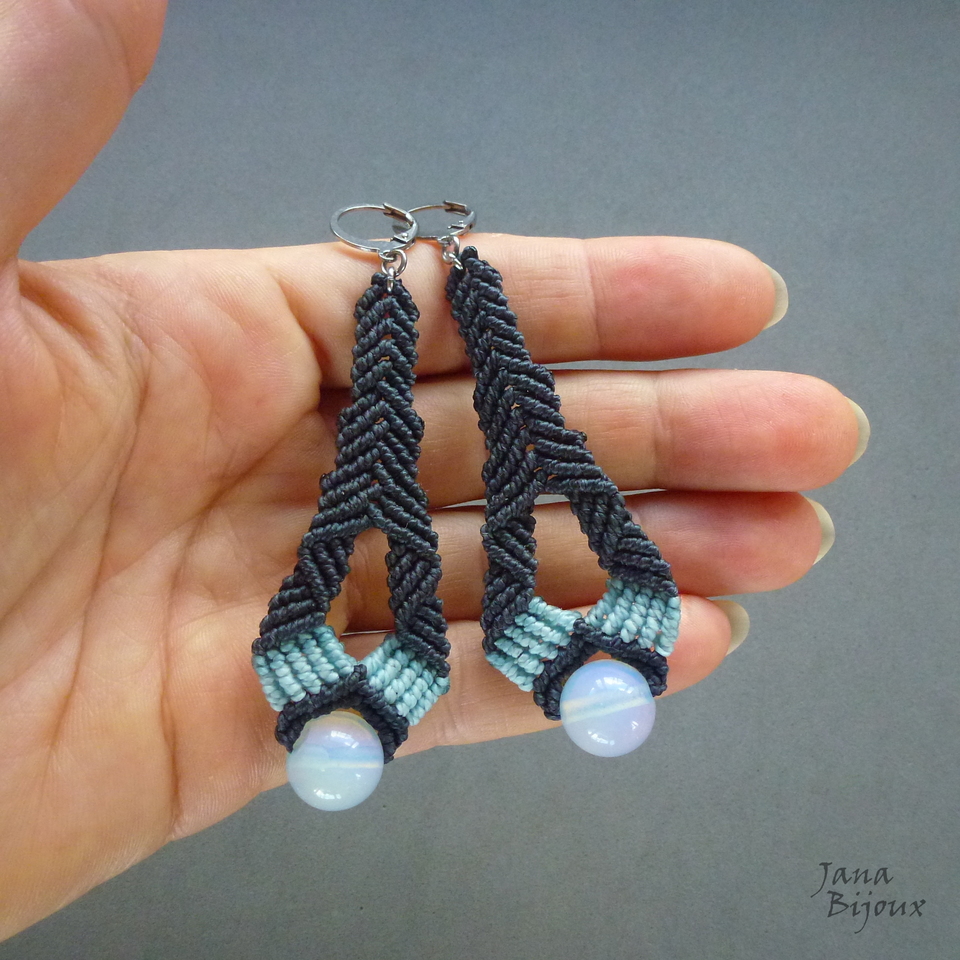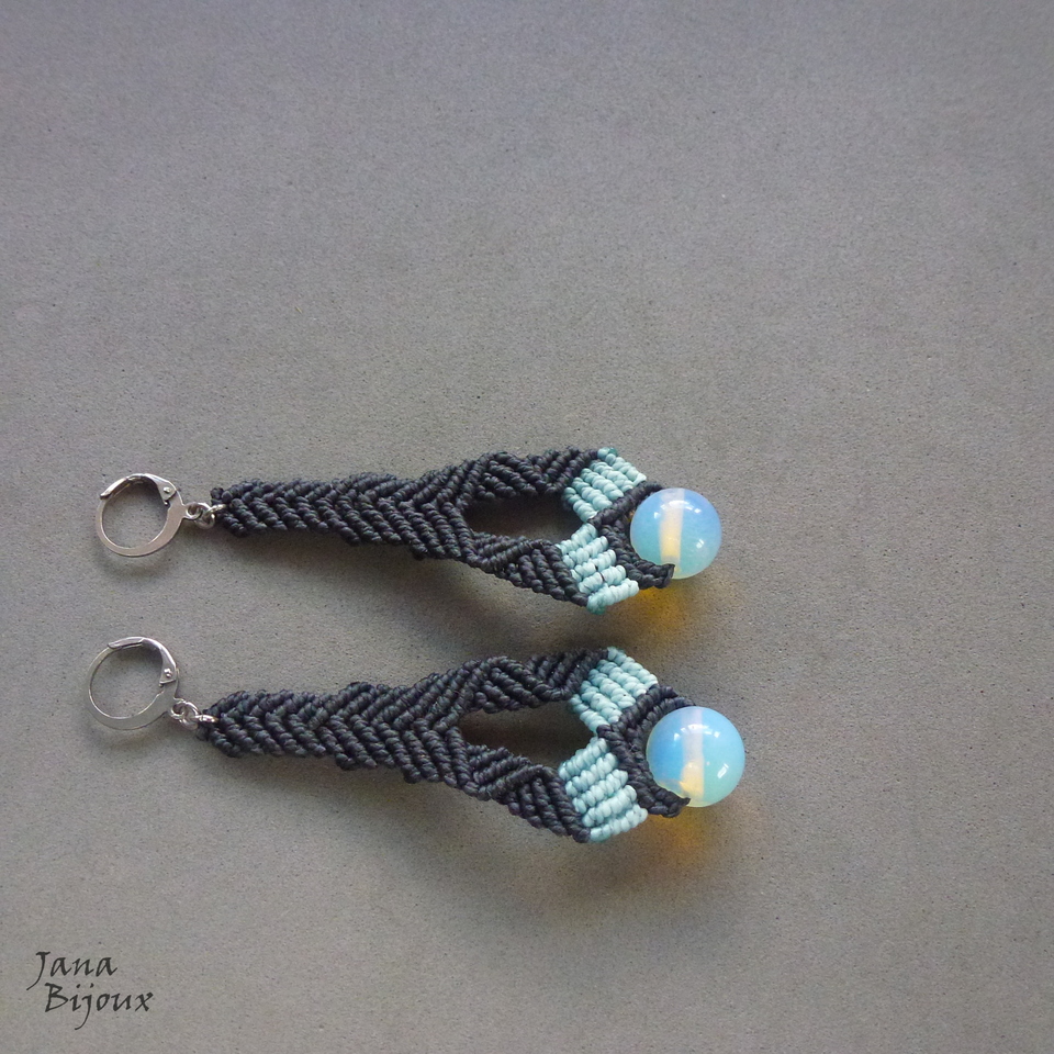 Opalita num brinco cor grafite e azul claro em leve degrade de 2 tons. Comprimento 8,2 cm, fecho de aço inox.