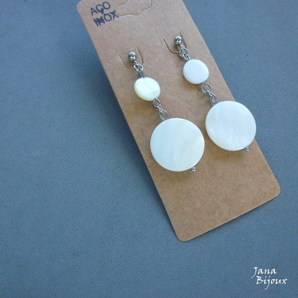 Brincos de madrepérola e aço inox, 5,5 cm. R$ 18,00