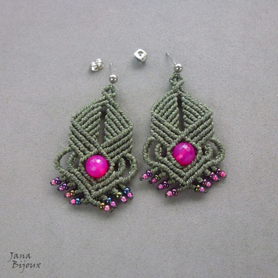Novo modelo de brincos, com ágatas tingidas, fio cor verde acinzentado e franja. Fecho de inox, comprimento 5,5 cm. R$ 36,00