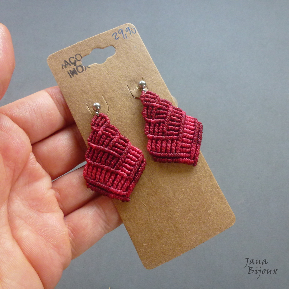 Brincos de macramé em cores bordô e pink, fecho de aço inox com tarracha. Comprimento 4,5 cm. R$ 29,90