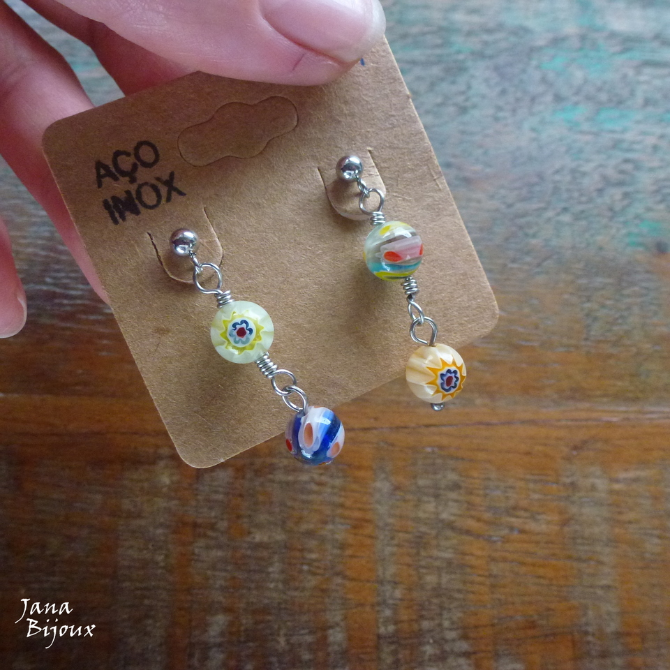 Brincos de inox millefiori, últimas 4 peças de vidro redondo.. italiano, com tarraxa. Comprimento 3,6 cm R$ 22,00