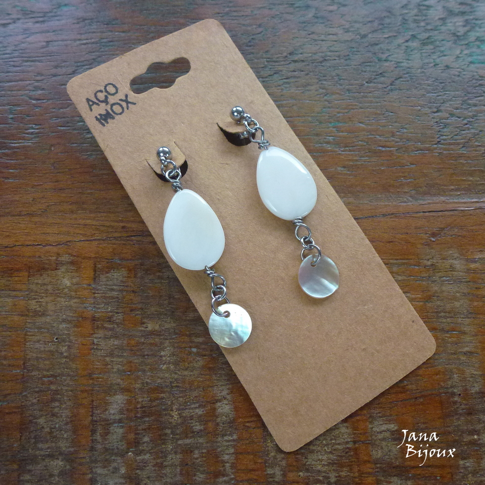 Brincos compridos 5 cm de inox, com conchas e madrepérolas, tarraxa R$ 22,00