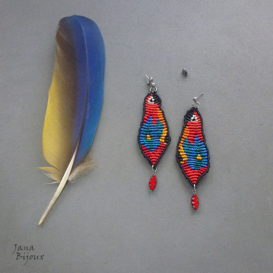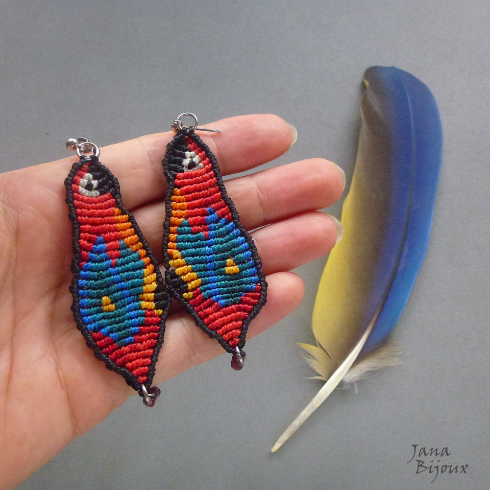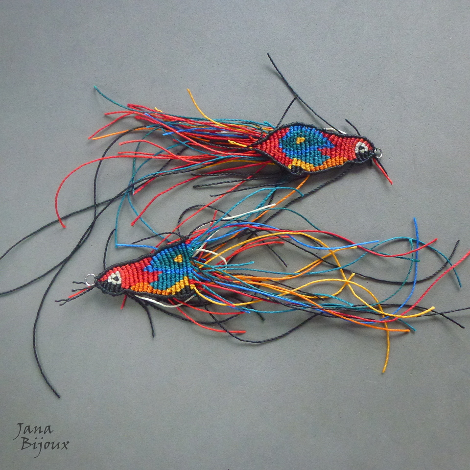 Brincos artesanais, formato de araras, feitos de macramé. Comprimento 9 cm, acabamento todo e fechos de inox com tarraxa. R$ 55,00