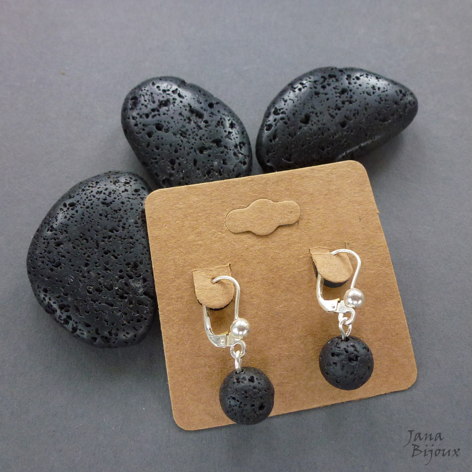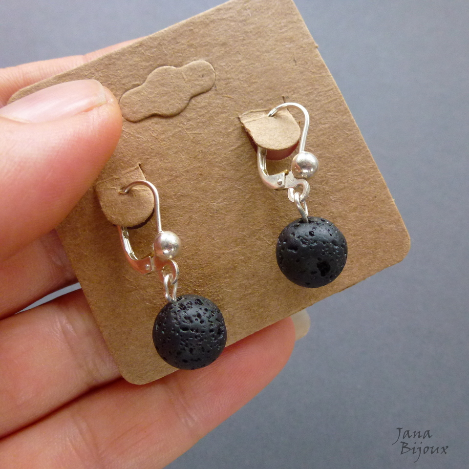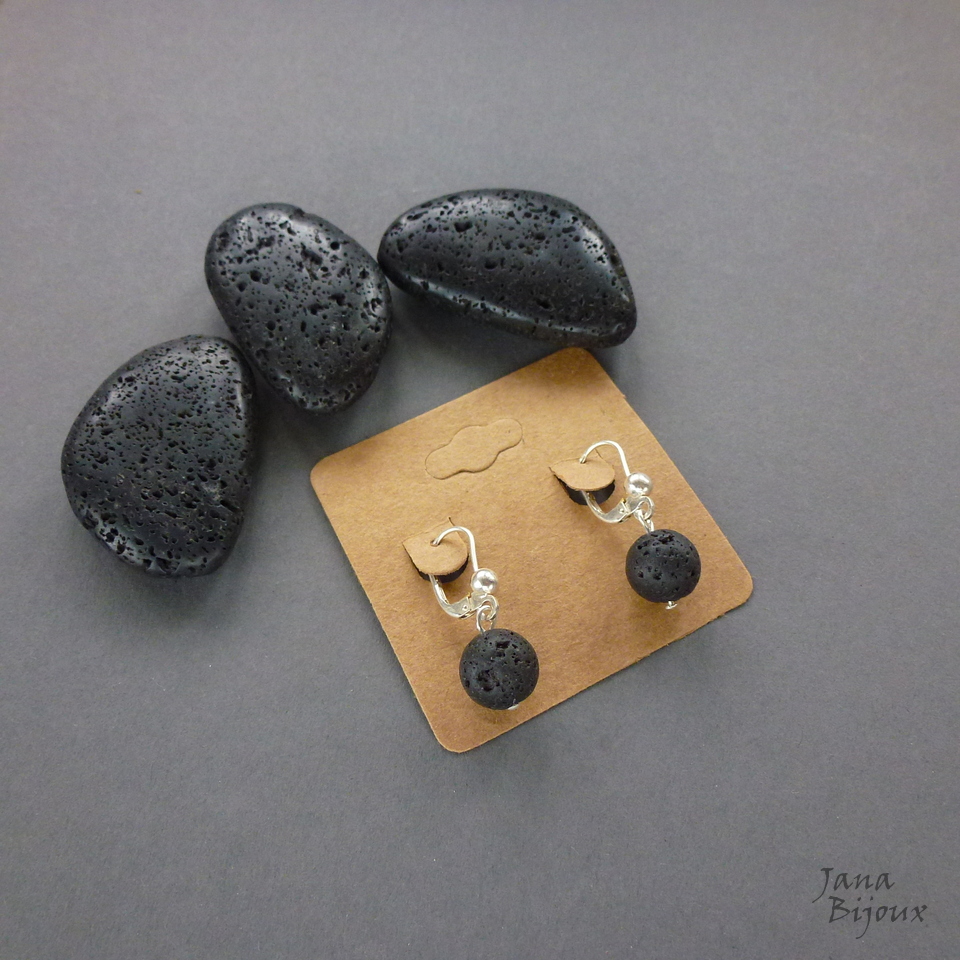 Brincos leves de prata 925 com bolas de pedra de vulcão. 3,1 cm, bolas de 1 cm. R$ 33,00