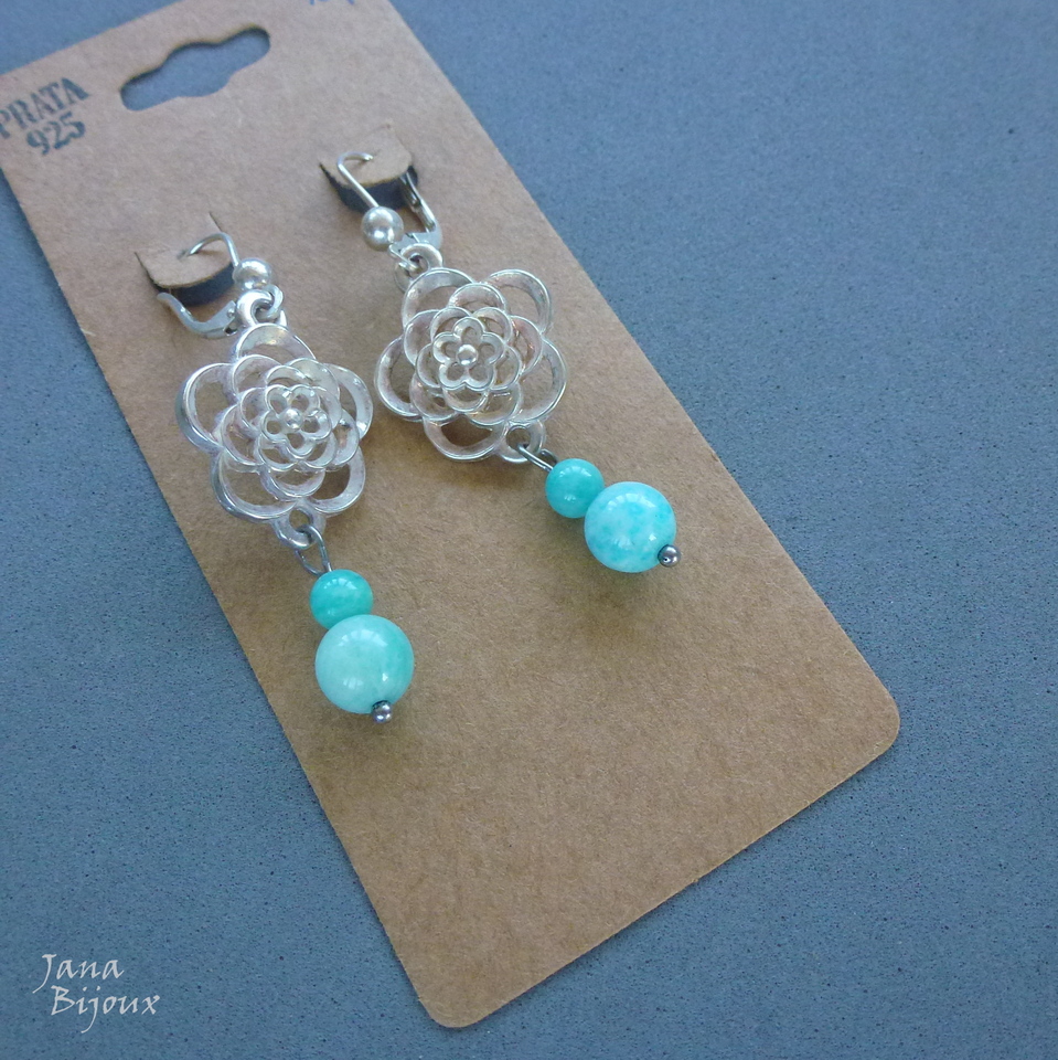 Brincos de prata com amazonitas naturais, comprimento 5,3 cm