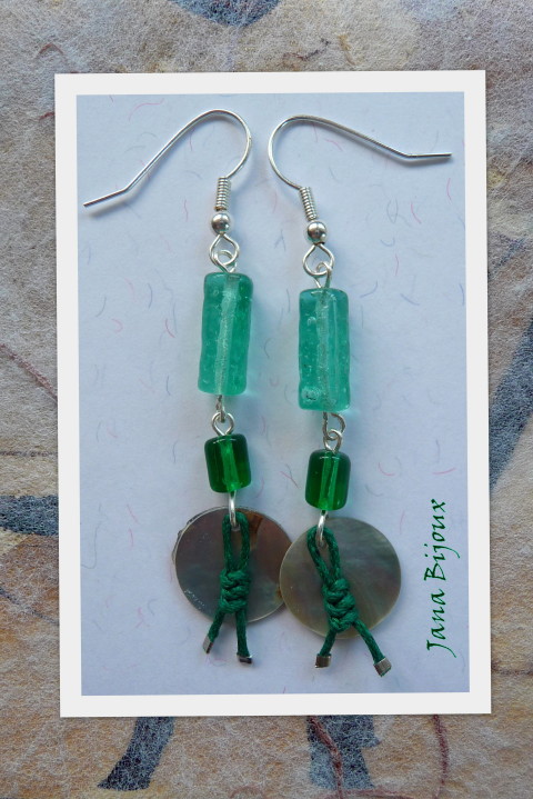 Brincos com toque oriental, vidros, conchas, macramé chinês e banhados à prata R$ 16,00. Possível com tarraxa de silicone. O fundo é desenho artístico de Beate Langer.