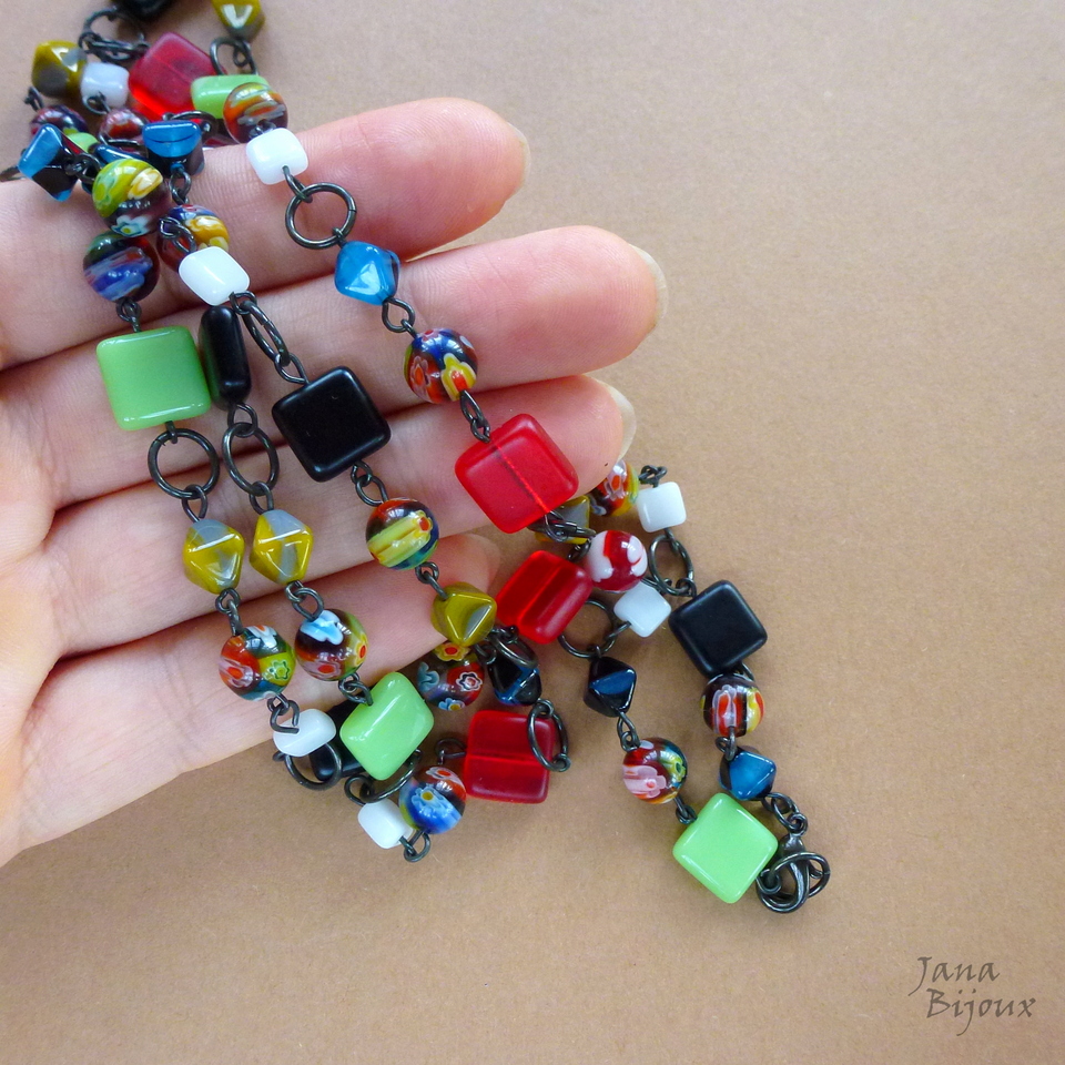c1007 15/02/2015VENDIDOS ( Prodáno)Jana Bijoux Colar comprido 84 cm de componentes pretos, vidro colorido quadrado e millefiori R$ 39,90