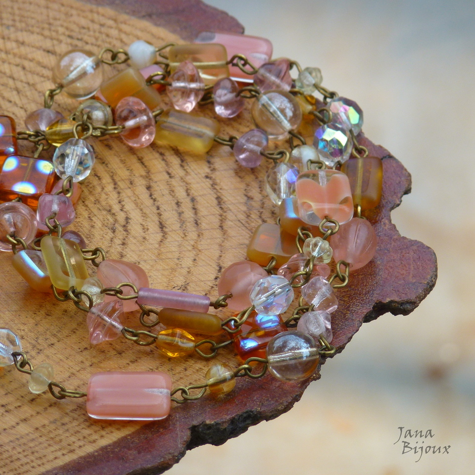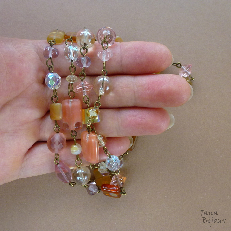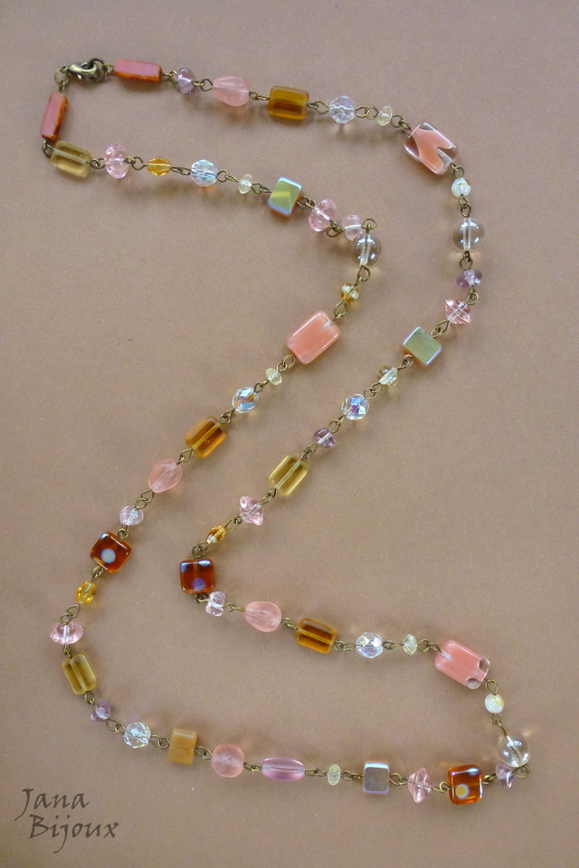 c1053 24/09/2015VENDIDOS ( Prodáno)Jana Bijoux Colar comprido 92 cm de cristais e vidros.. tons amarelos, salmão e rosados, componentes ouro velho R$ 48,00 Possível com esta pulseira n129 por R$ 22,00.