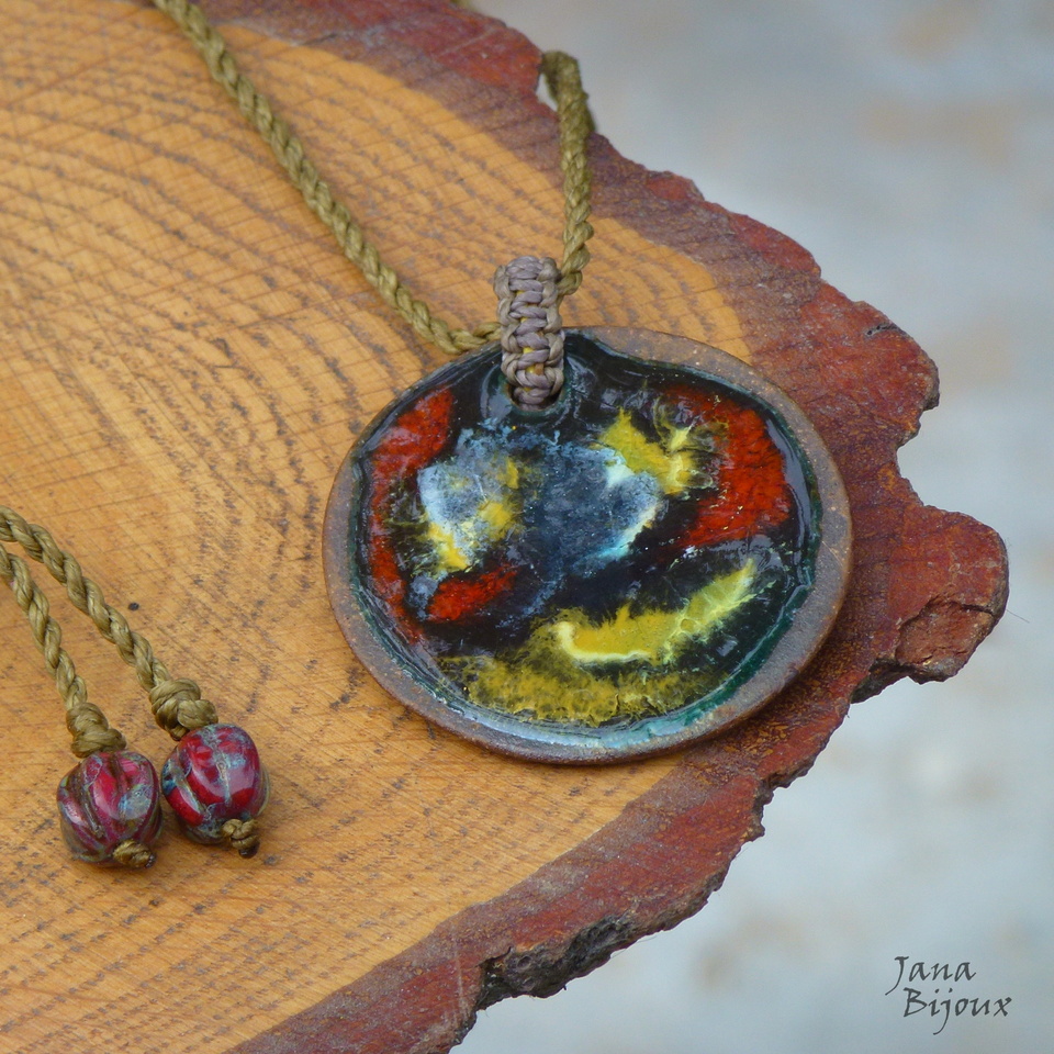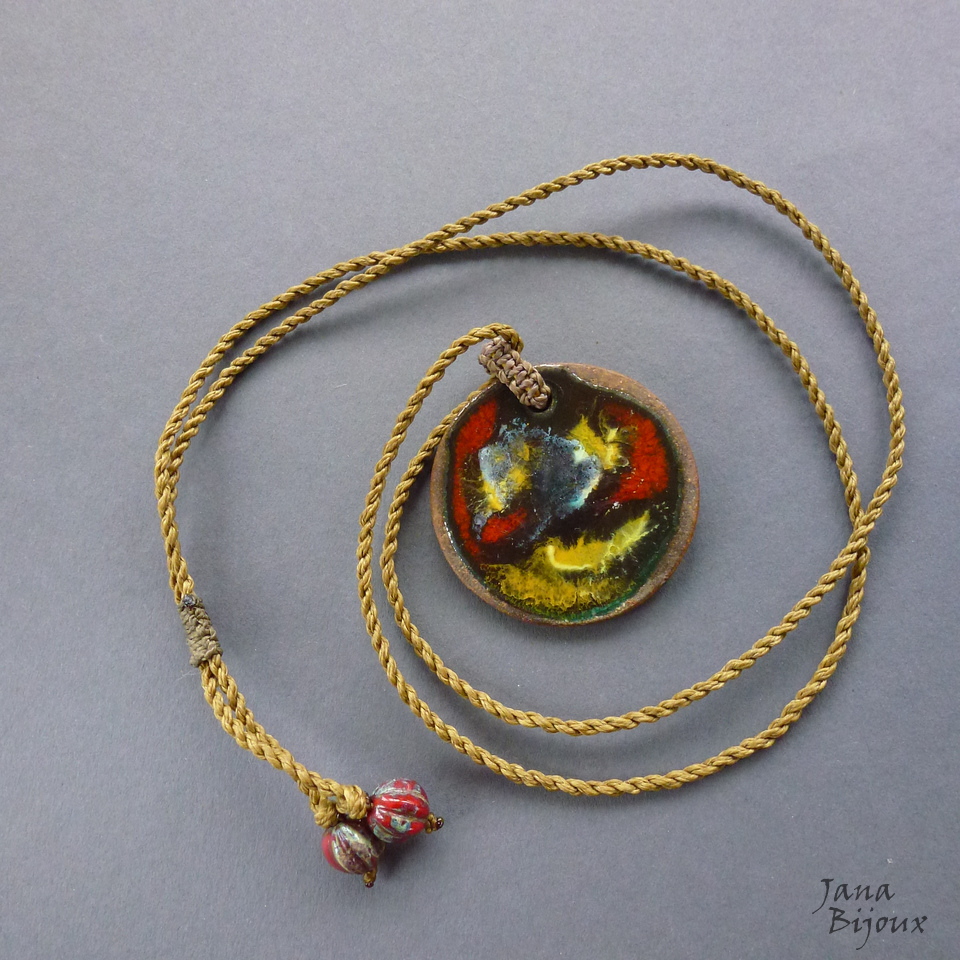 Colar com comprimento regulável, medalhão de cerâmica de 4,5 cm. Colar é feito de 3 tons de fios.. para dar um ar de emendado, reciclado, não certinho, não combinadinho… mas todos tons são nas cores de esmaltação da cerâmica e é sutil. 2 vidro na ponta. R$ 25,00