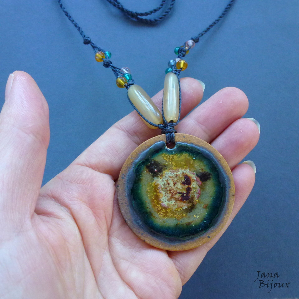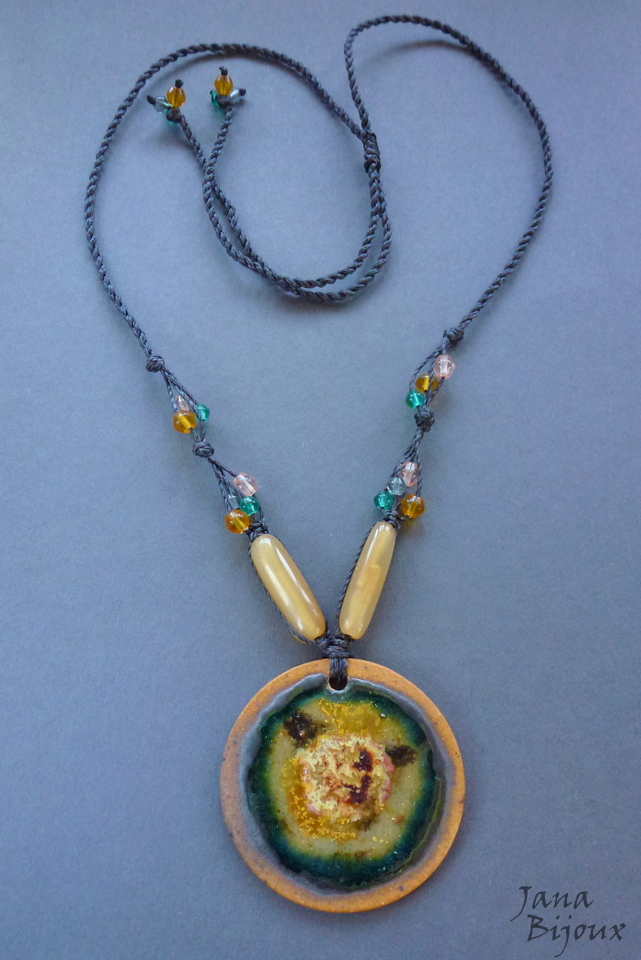 Colar com comprimento regulável, medalhão de cerâmica de 4,5 cm do ateliê da Janete Dallabona . Com vidro nas laterias e 2 peças raras, grandes de chifre. Nas pontas tmb com vidro R$ 36,00