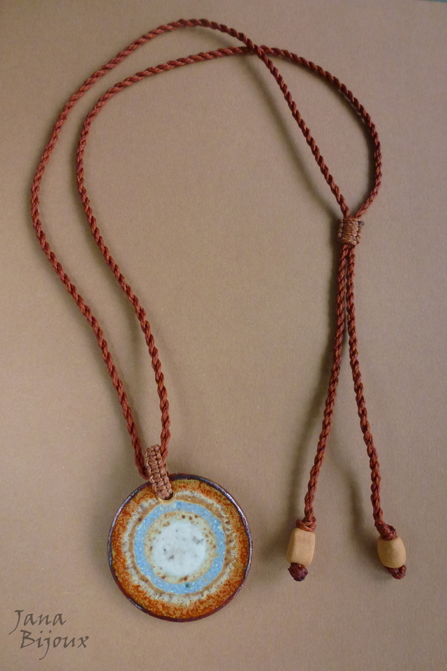 Colar com comprimento regulável, medalhão de cerâmica de 4,5 cm.  Colar é feito de 2 tons de fios.. para dar um ar de emendado, reciclado, não certinho, não combinadinho…  mas todos tons são nas cores de esmaltação da cerâmica e é sutil.  2 cerâmicas na ponta. R$ 25,00