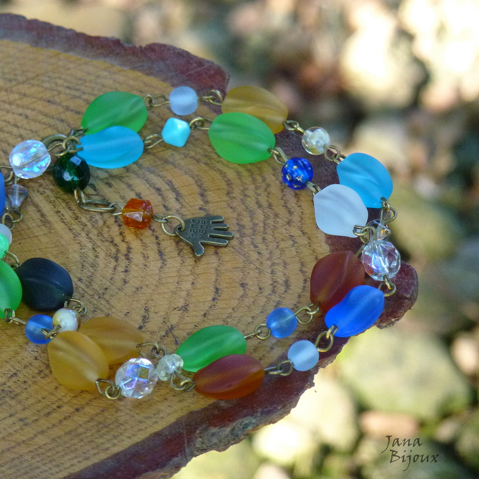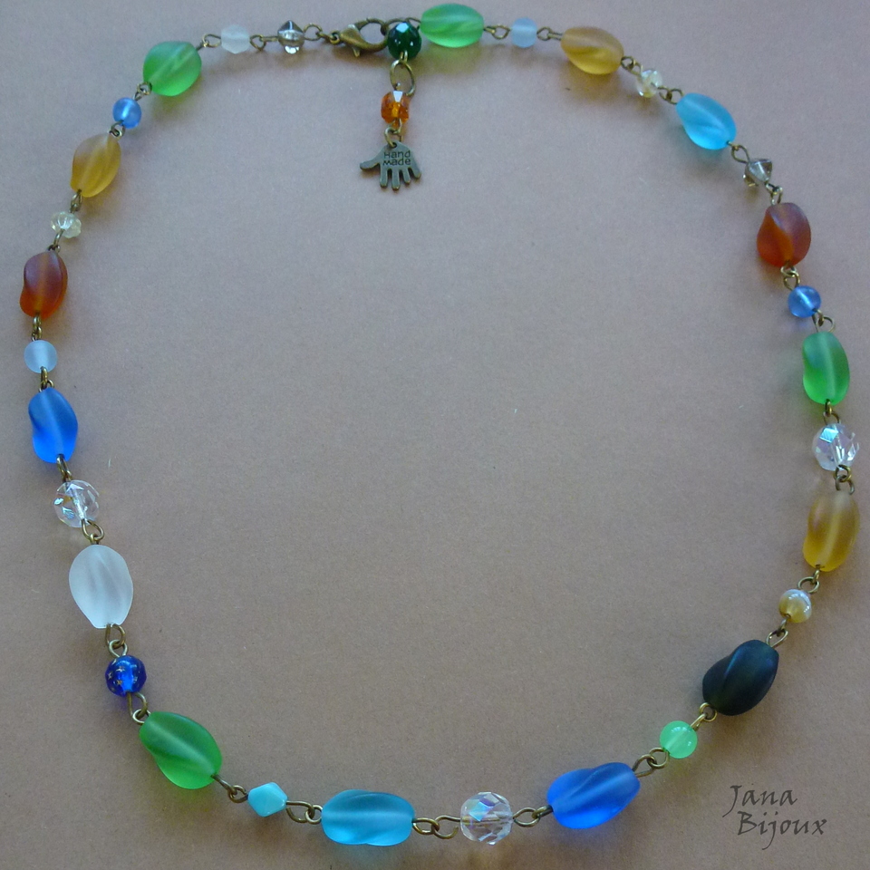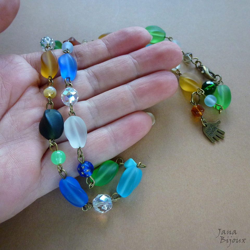 Colar curto 51,5 cm (com 3 cm para prolongar + pingente de mão com escrita HAND MADE ) de vidro grande, fosco, da República Tcheca e componentes em ouro velho. R$ 33,00 SUPER PEÇA ÚNICA