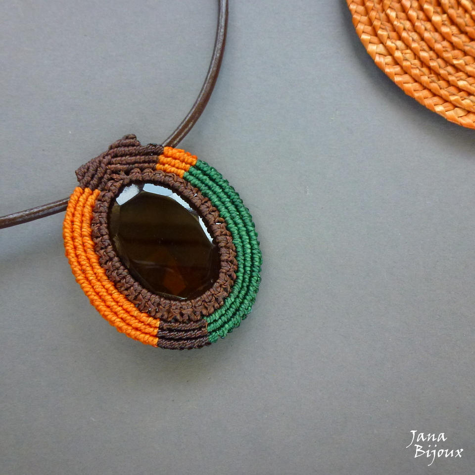 Colar comprido de couro marrom chocolate, vidro lapidado a mão marrom e macramé em volta assimétrico. Acabamento ouro velho, em formato de T.  Possível tmb encurtar o couro sem custo adicional.