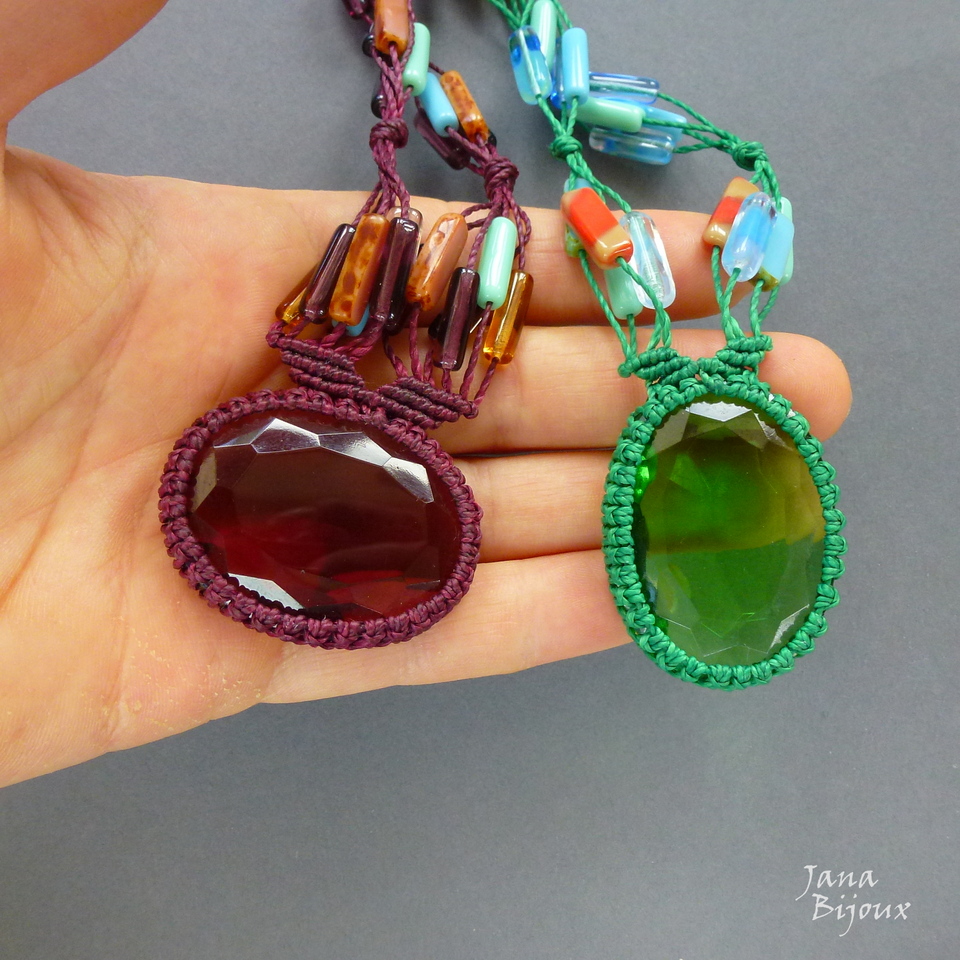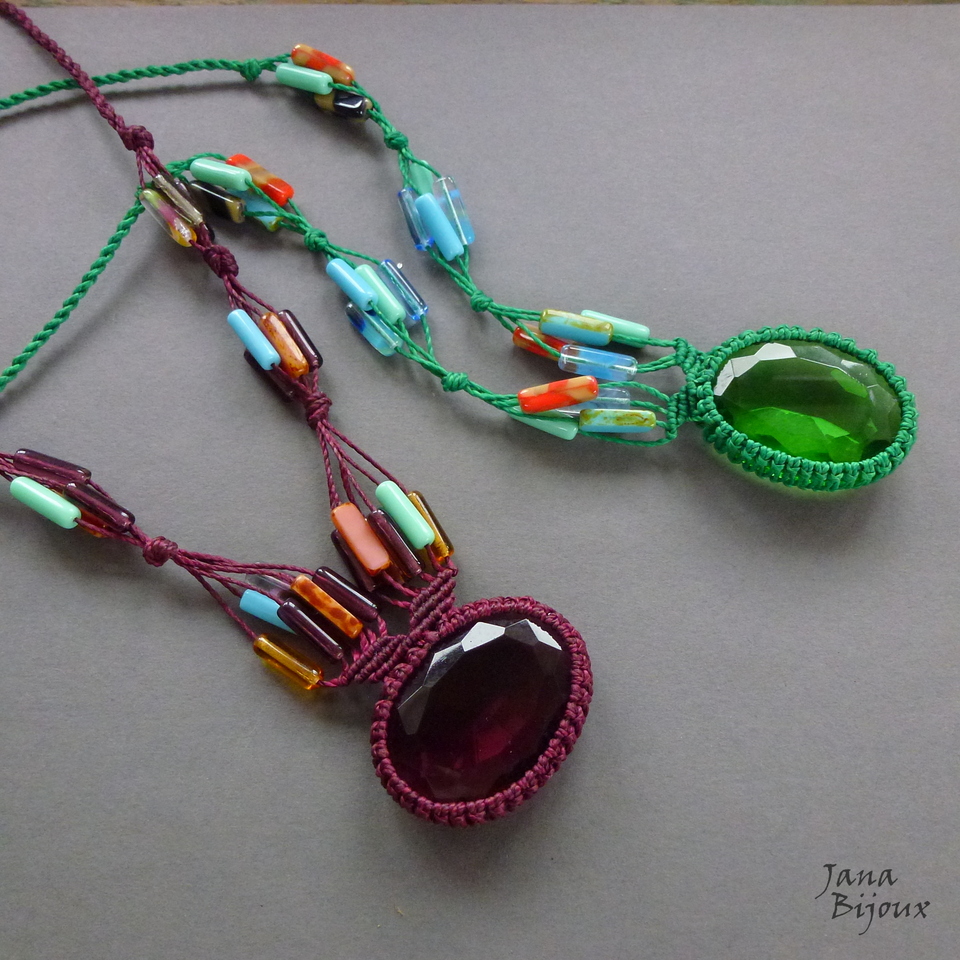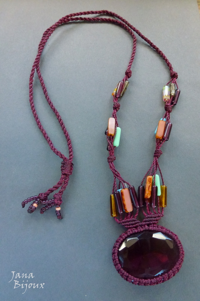 Colar comprido com vidros, macramé, comprimento ajustável.
