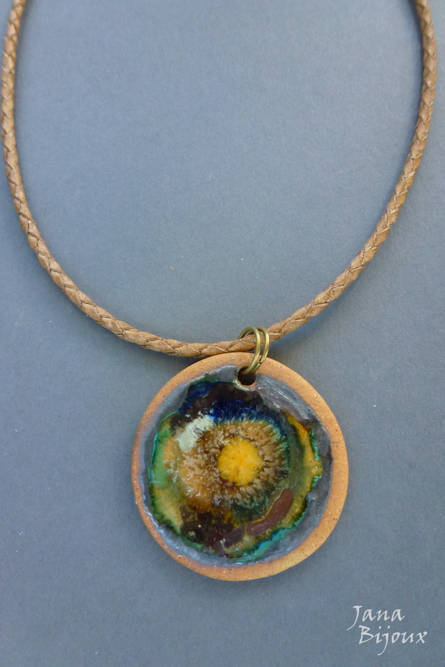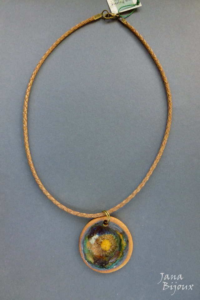 Colar curto 50 de couro trançado cor natural com medalha e cerâmica, componentes ouro velho .