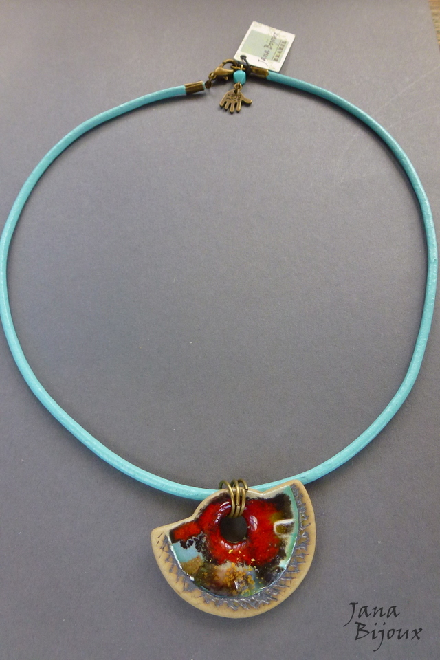 Colar curto 50 cm com vidro na mesma cor que couro e mini pingente de HAND MADE na ponta , colar é de couro cor azul claro com medalha e cerâmica vazada , componentes ouro velho . R$ 33,00