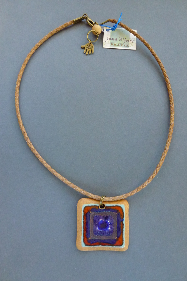 c1148 09/12/2016VENDIDOS ( Prodáno)Jana Bijoux Colar curto 47 de couro trançado cor natural com medalhão quadrado de cerâmica, bolinha de cerâmica na ponta do fecho e mini pingente de HAND MADE, componentes ouro velho. R$ 33,00 Pingente mede 4 cm.