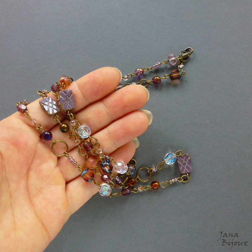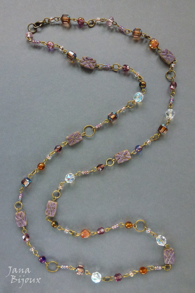 c1177 08/03/2017VENDIDOS ( Prodáno)Jana Bijoux Colar comprido 91 cm, delicado, com vidro importado da República Tcheca, em tons de rosa antigo, lilás, uva, furta-cor .. componentes ouro velho.. e argolas. Colar tem ar de vintage R$ 49,90.