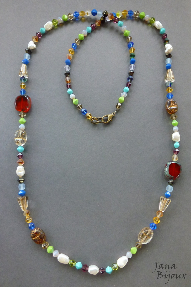 Colar comprido 93,5 cm com vidro colorido importado e 9 pérolas de água doce. Peças maiores de vidro distribuidas assimetricamente, mas discreto no mesmo tempo, combina com muitas cores de roupa. Fecho em ouro velho R$ 49,90
