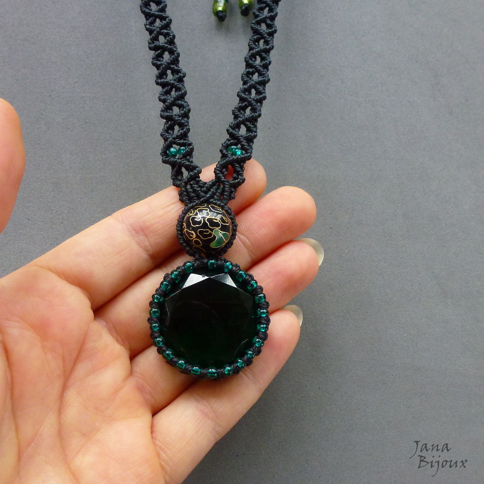 Pedra mede 3,5 cm, cor verde escuro em volta dele miçangas importadas + uma bola de cloisonné de 1,5 cm em cima dele, luxuoso.
