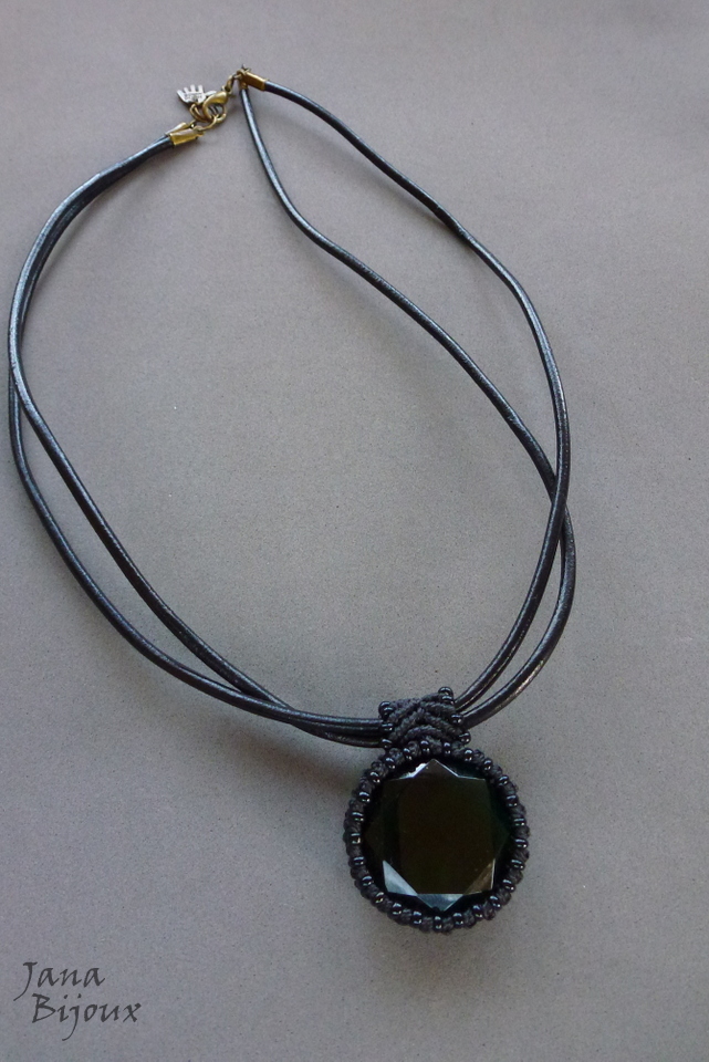 Colar curto 52 cm, couro duplo, com pingente  de vidro e macramé,