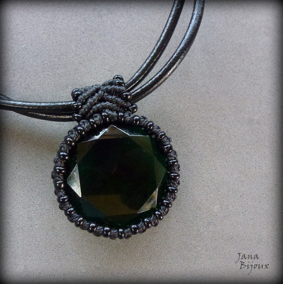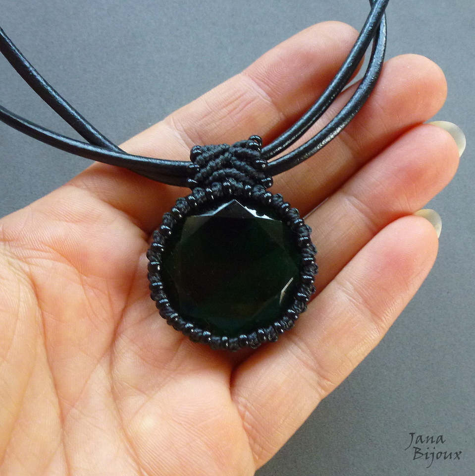 Vidro mede 3,5 cm e é verde escuro. Com macramé o pingente tem 4,2 cm e tem movimento livre no couro. Miçangas pretas, acabamento ouro velho. R$ 36,00
