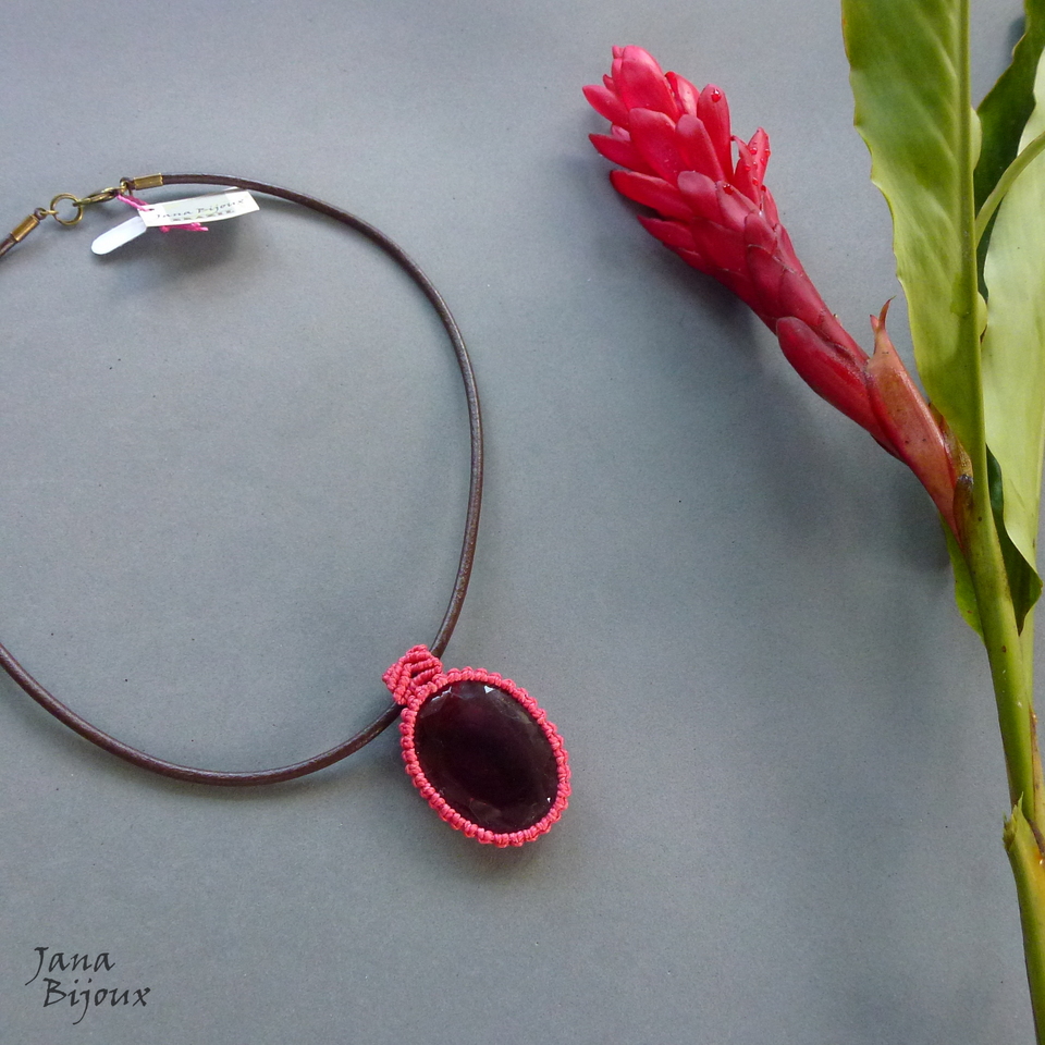 Colar curto com macramé em volta do pingente de vidro e couro de 49,5 cm.