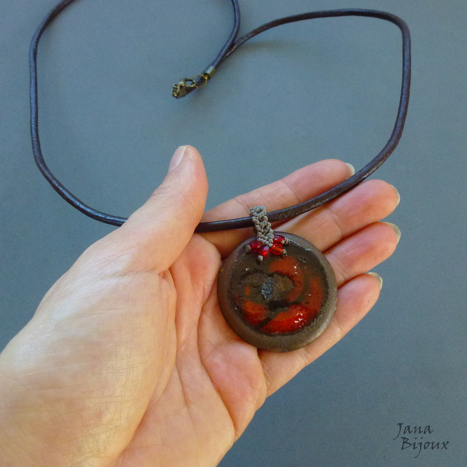 Colar rústico com cerâmica vermelha da Janete Dallabona de 4,5 cm, alça de macramé e 4 cristais vermelhos, couro comprido 80 cm, acabmento ouro velho R$ 33,00.