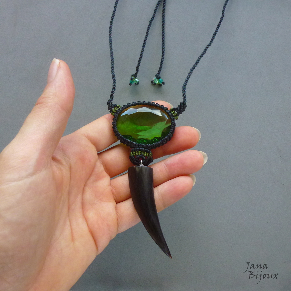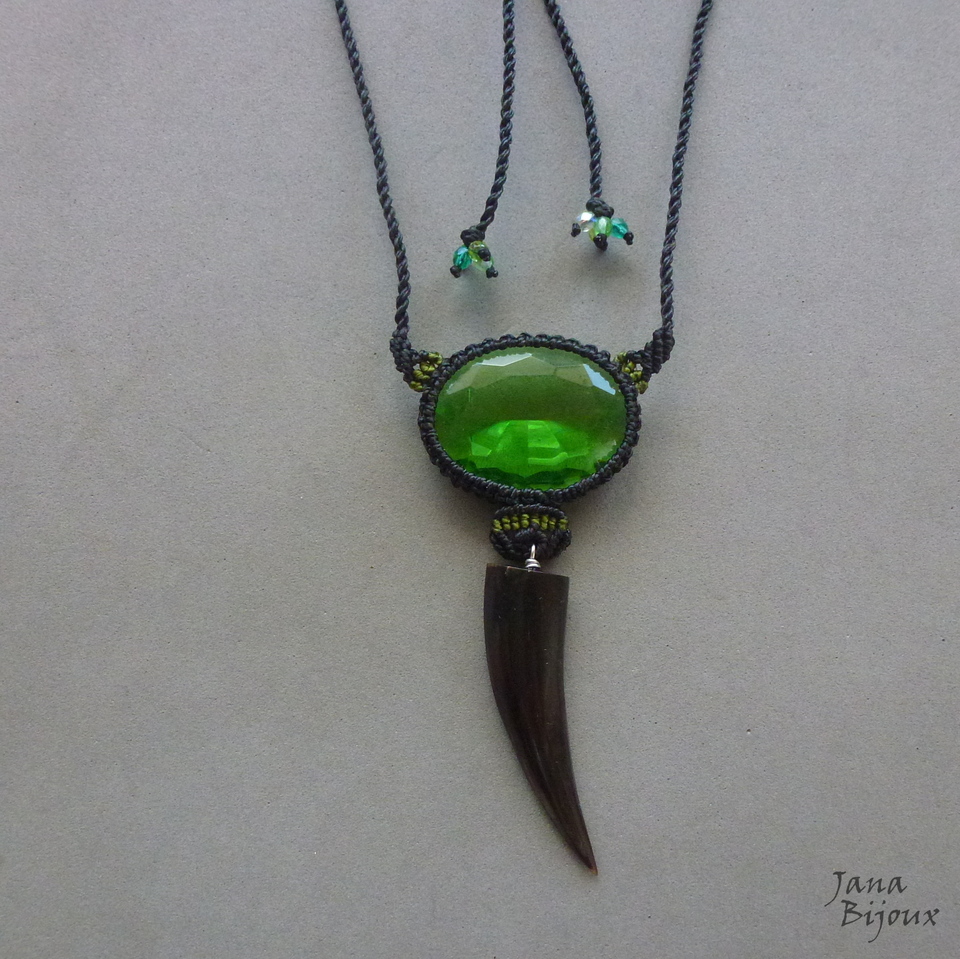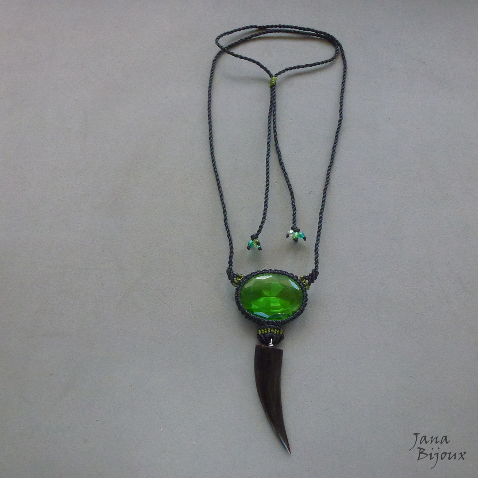 Colar com vidro verde, macramé preto, comprimento ajustável.