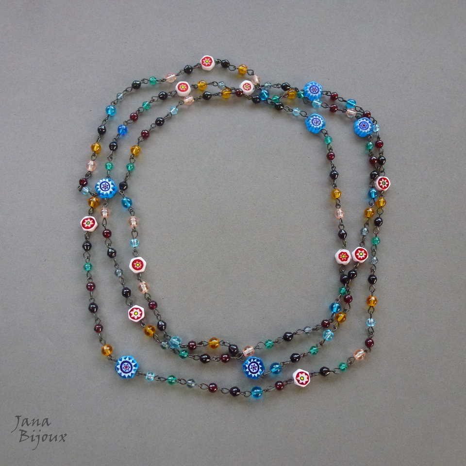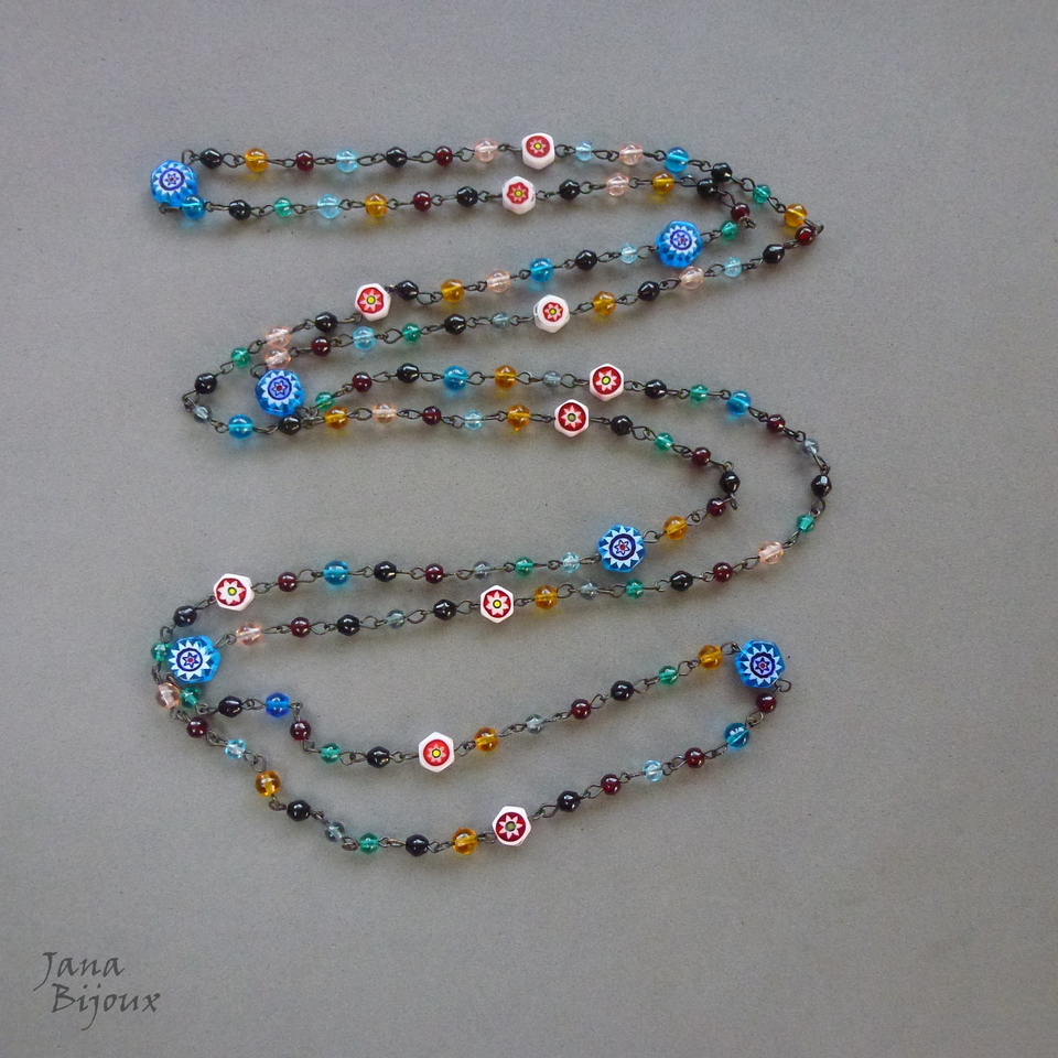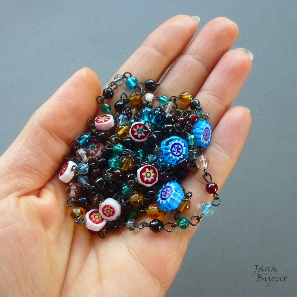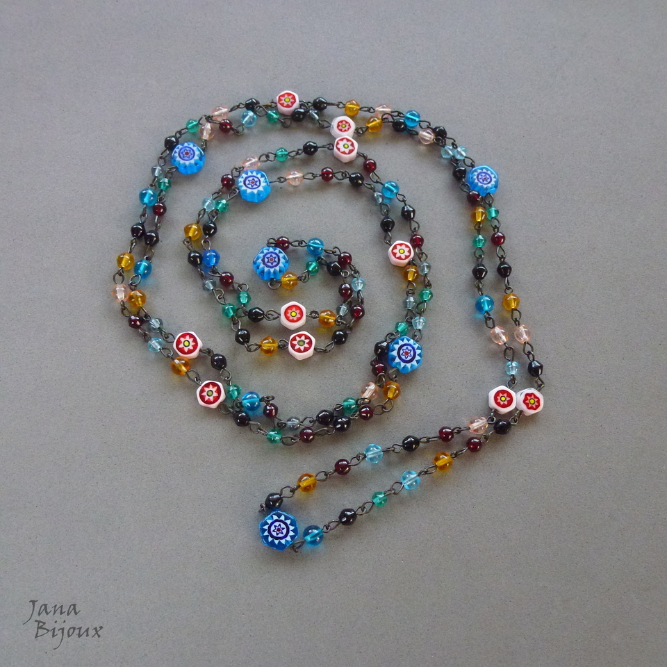 Colar comprido 154 cm, colorido, vidro importado e 16 millefiori. Colar sem fecho, componentes pretos, pode ser usado como colar de 2 voltas como curto e comprido ou de 3 voltas colar curto. Caso vc prefere, posso colocar fecho preto no colar. R$ 68,00 PEÇA ÚNICA