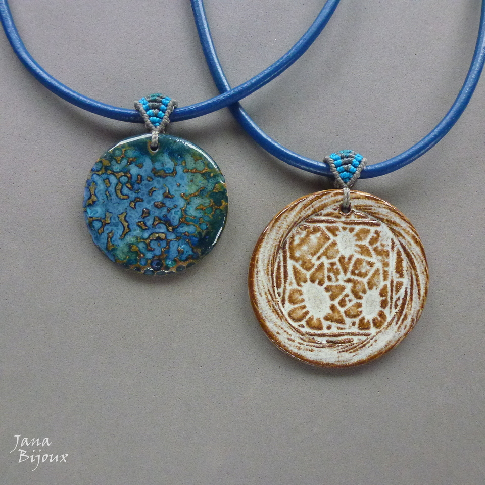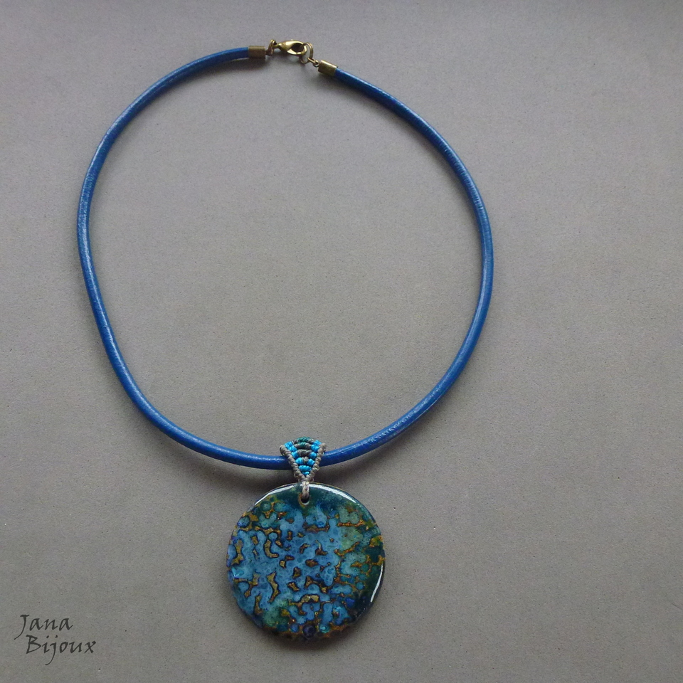 Colar azul em couro importado, cerâmica artesanal e macramé na alça. Comprimento 50 cm. Cerâmica 5 cm, com alça altura é de 6,2 cm, pingente tem livre movimento no couro. Acabamento em ouro velho, fecho maior 1,5 cm para look mais luxuoso e manuseio mais fácil. R$ 29,90