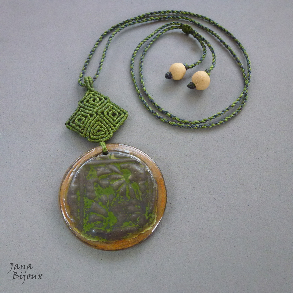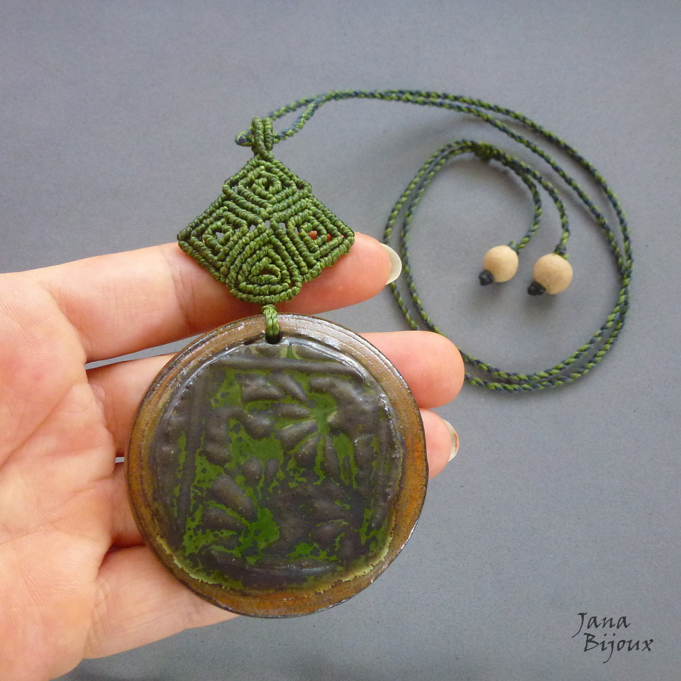 Cerâmica grande, feita a mão 5,7 cm pela @luciane_schwarz, macrame em cima dela é feito de fio em cor verde musgo. A cerâmica tem movimento livre no cordão e pingente todo mede 10 cm .