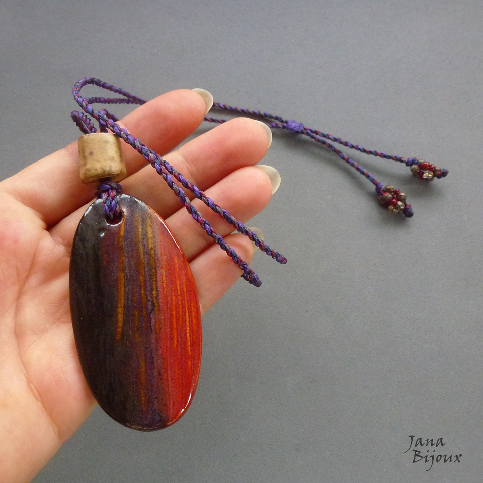Colar simples, porém artesanal. Cerâmica feita a mão 7 cm pela @luciane_schwarz, com leve metalizado, cordão feito a mão 84 cm, torcido de 4 tons que combinam com a cerâmica (beringela , roxo, marinho escuro e beterraba). Nas pontas vidro e miçangas, comprimento ajustável, pode ser usado curto, médio ou comprido.