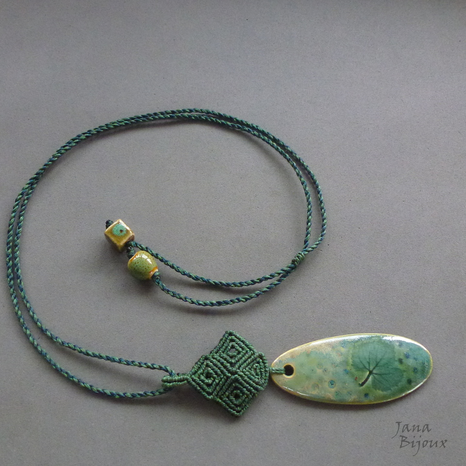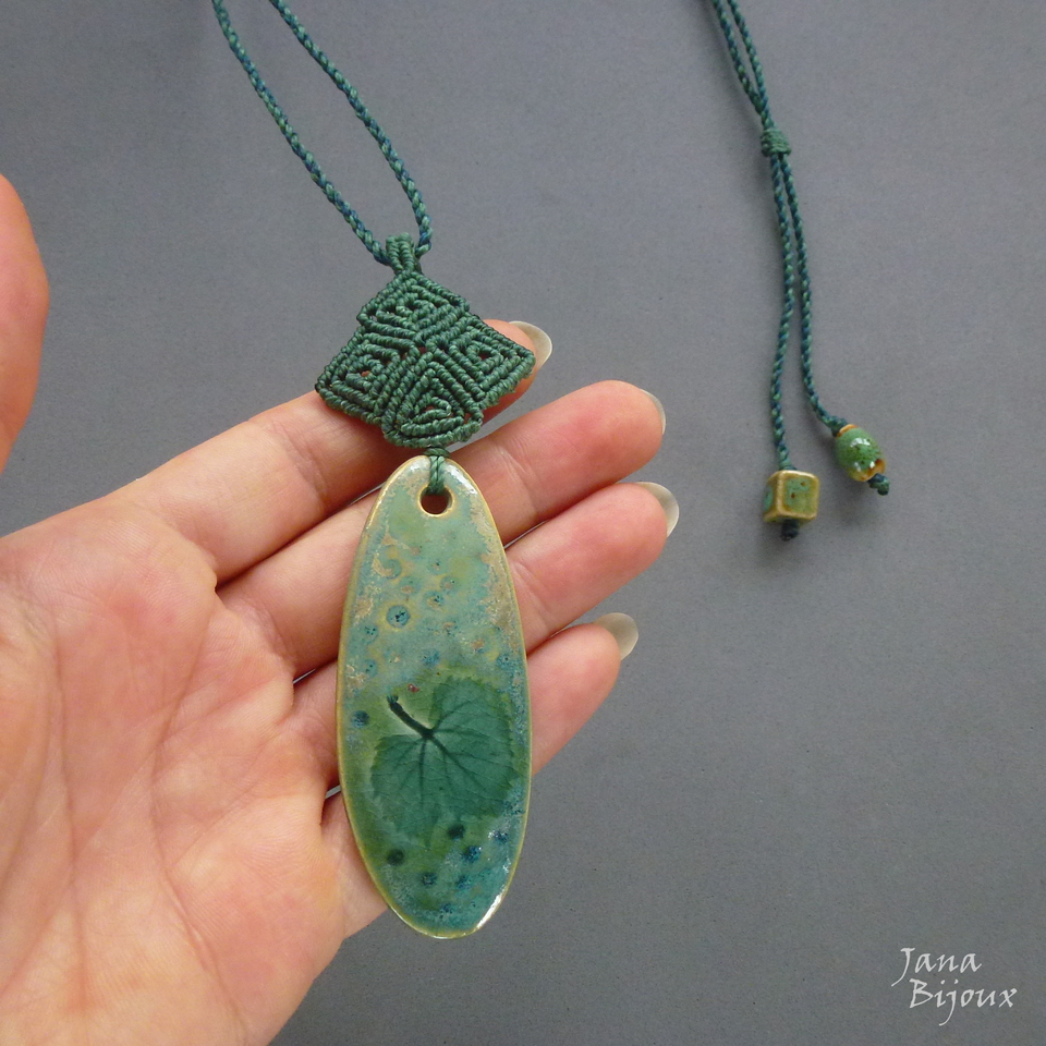 Cerâmica delicada, com desenho de folha. Feita a mão pela @luciane_schwarz, tem 7 cm x 3 cm, com macrame em cima dela pingente mede 11,5 cm. A cerâmica tem movimento livre no cordão .