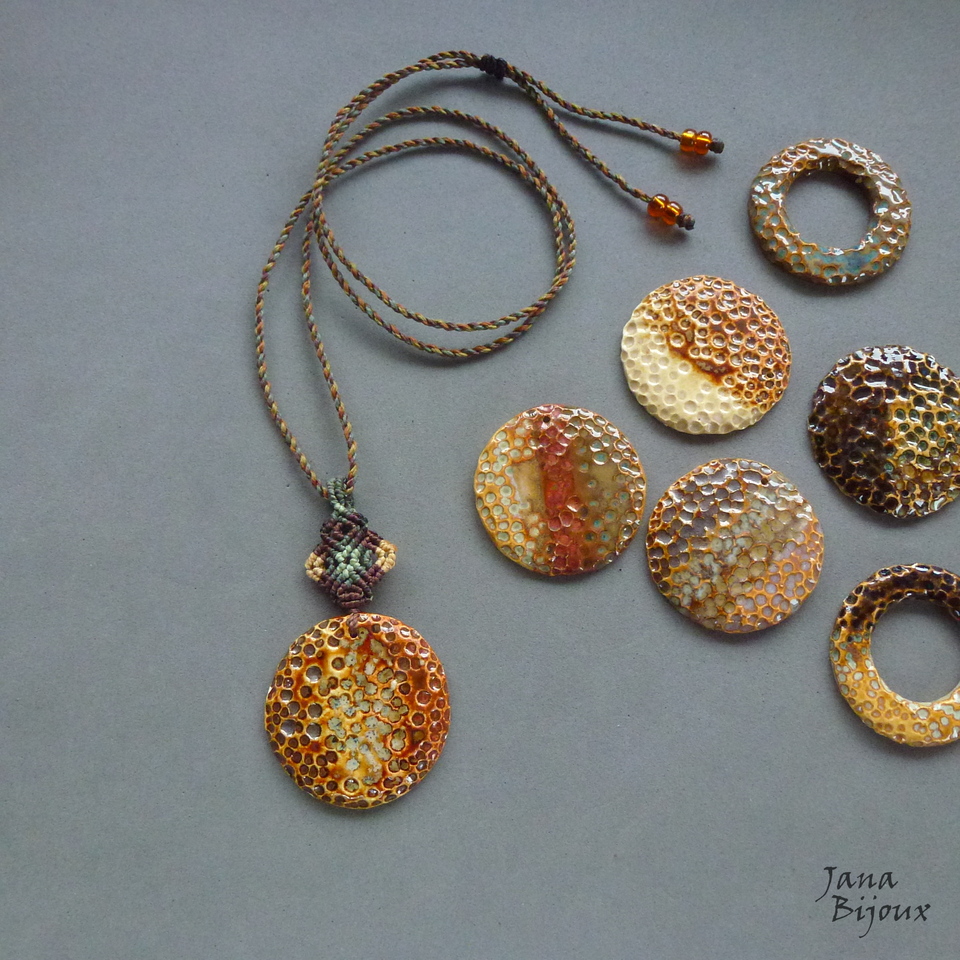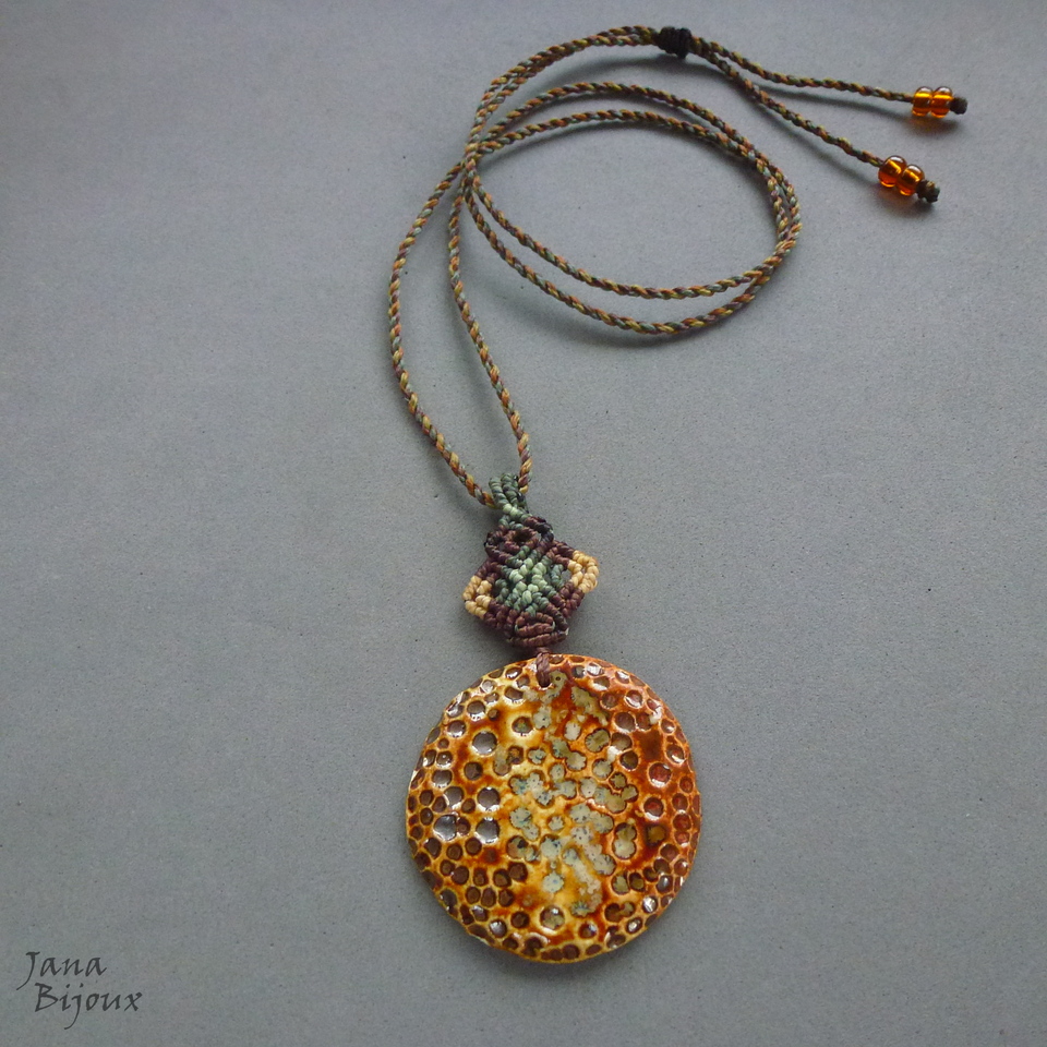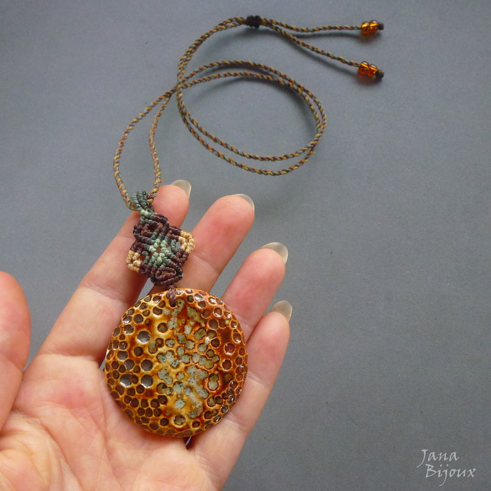 Colar com pingente menor e detalhe em macramé, a cerâmica feita a mão pela @luciane_schwarz, tem 4,6 cm, com macrame em cima dela pingente mede 8,3 cm. A cerâmica tem movimento livre no cordão .