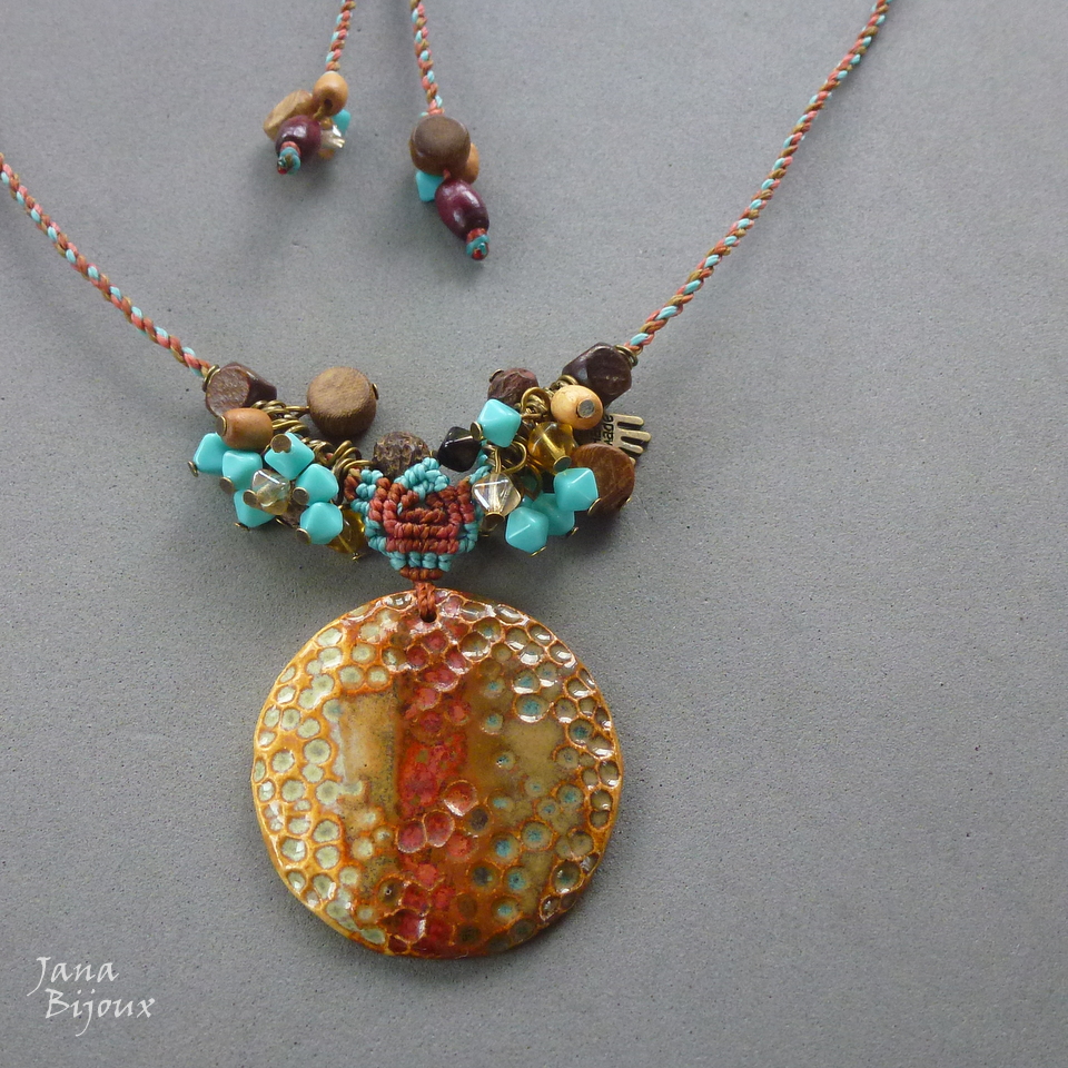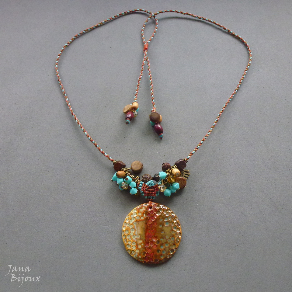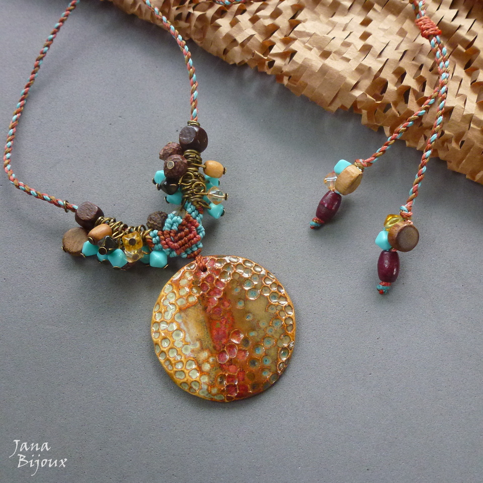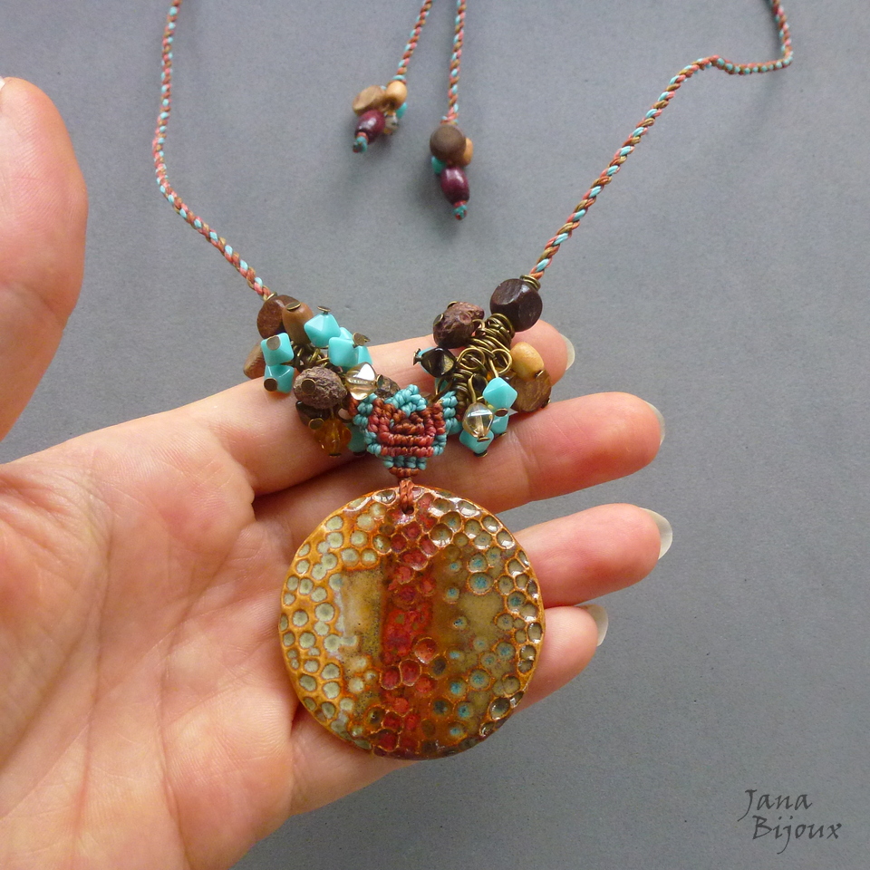 Colar despojado, bagunçado, com contas de vidro de livre movimento, argolas de ouro velho, contas de madeira e sementes. Cerâmica artesanal da @luciane_schwarz, de 4,5 cm, detalhe em cima dela em macramé de 4 tons. Comprimento ajustável, máximo de 80 cm, pode ser usado como curto, médio ou comprido. R$ 45,00