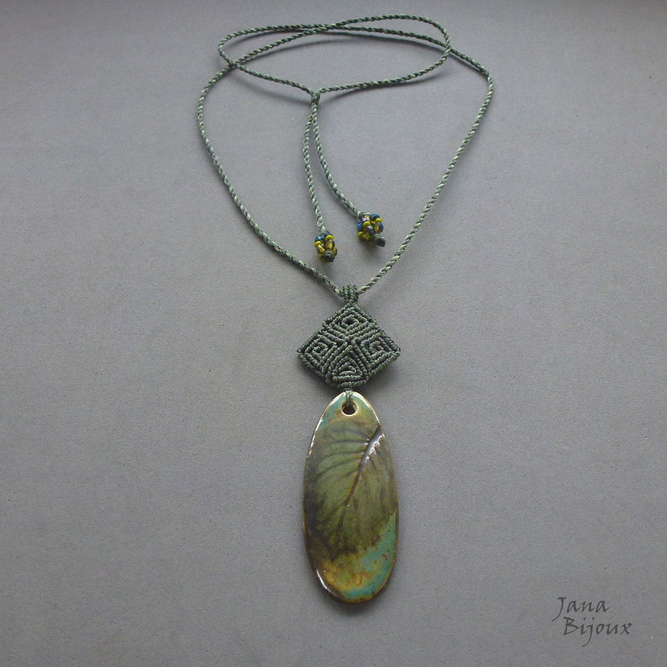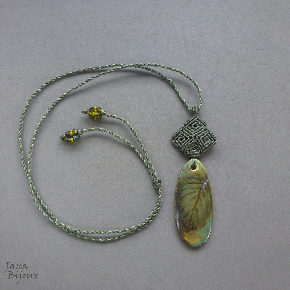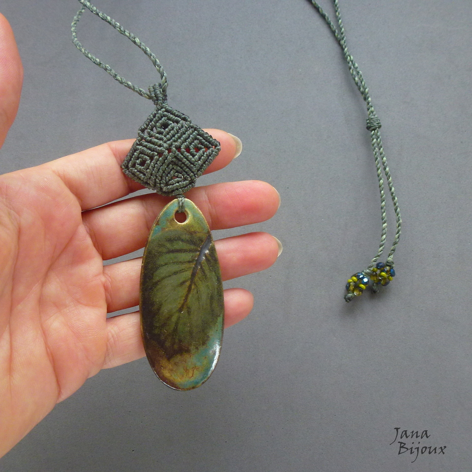 Cerâmica delicada, com desenho de folha. Feita a mão pela @luciane_schwarz, tem 6,7 cm x 3 cm, com macrame em cima dela pingente mede 11,2 cm. A cerâmica tem movimento livre no cordão .