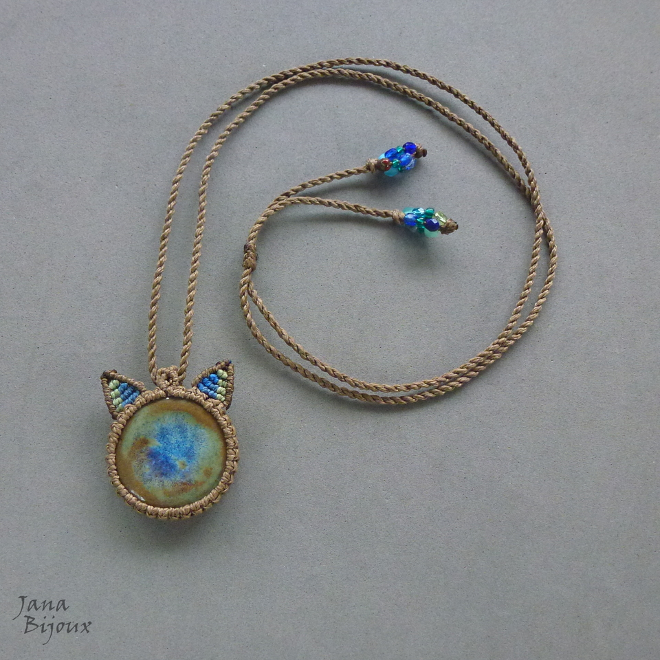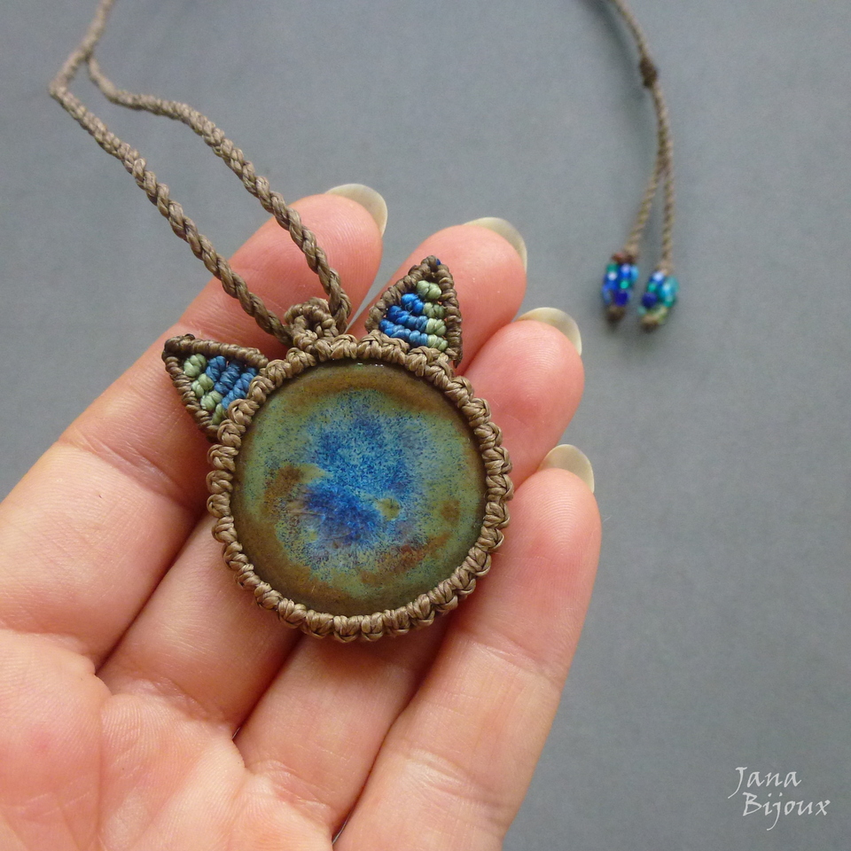 Colar de macramé, com pingente de cerâmica de 3 cm, de alta temperatura, feita pela @luciane_schwarz , estilizado em formato de cabeça de gato. Nas orelhas mix de cores.