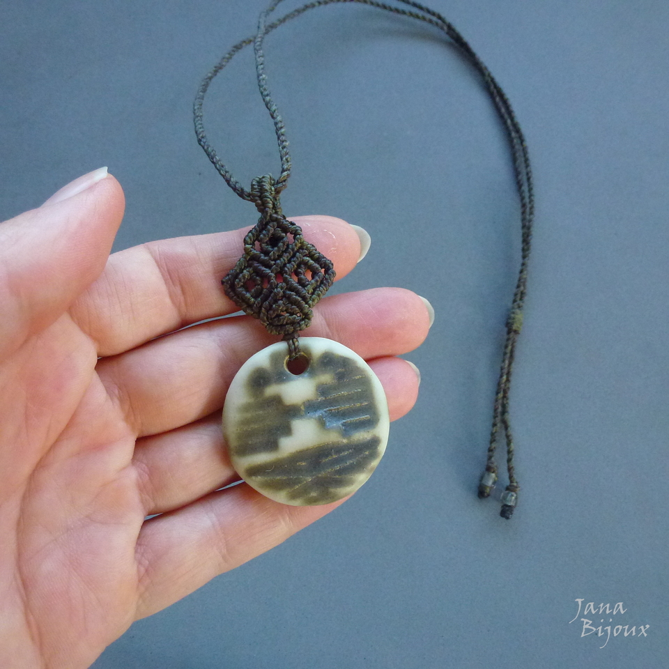 Colar com pingente menor, unissex , com detalhe em macramé,  tem 3,4 cm,  com macrame em cima dela pingente mede 7,1 cm. A cerâmica tem movimento livre no cordão .