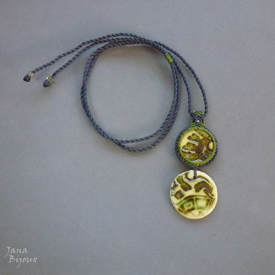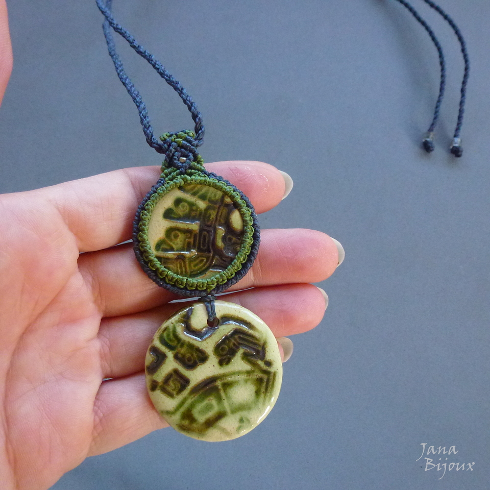 Colar unissex com pingente duplo em macramé, o pingente todo mede 8,8 cm. A cerâmica tem movimento livre no cordão .