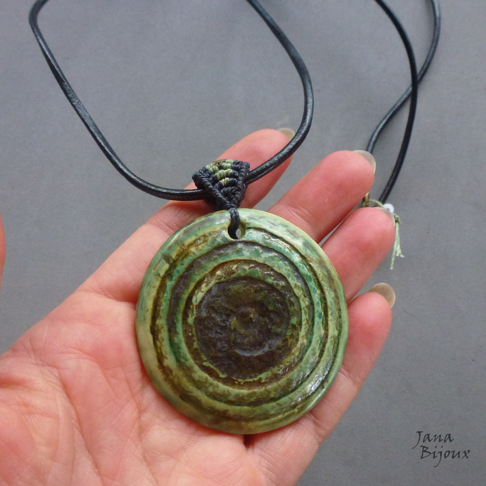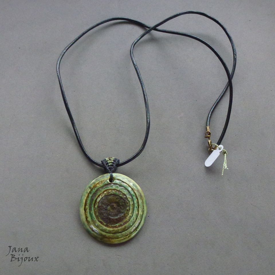 Colar com couro comprido 85 cm, cerâmica feita a mão de 5,7 cm e alça de macramé. Pingente todo mede 7,3 cm e tem movimento livre no couro. Acabamento em ouro velho, o fecho maior de 1,5 cm para look mais luxuoso e manuseio mais fácil, proporcional. R$ 34,00