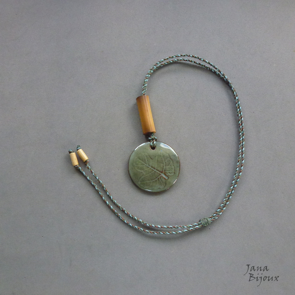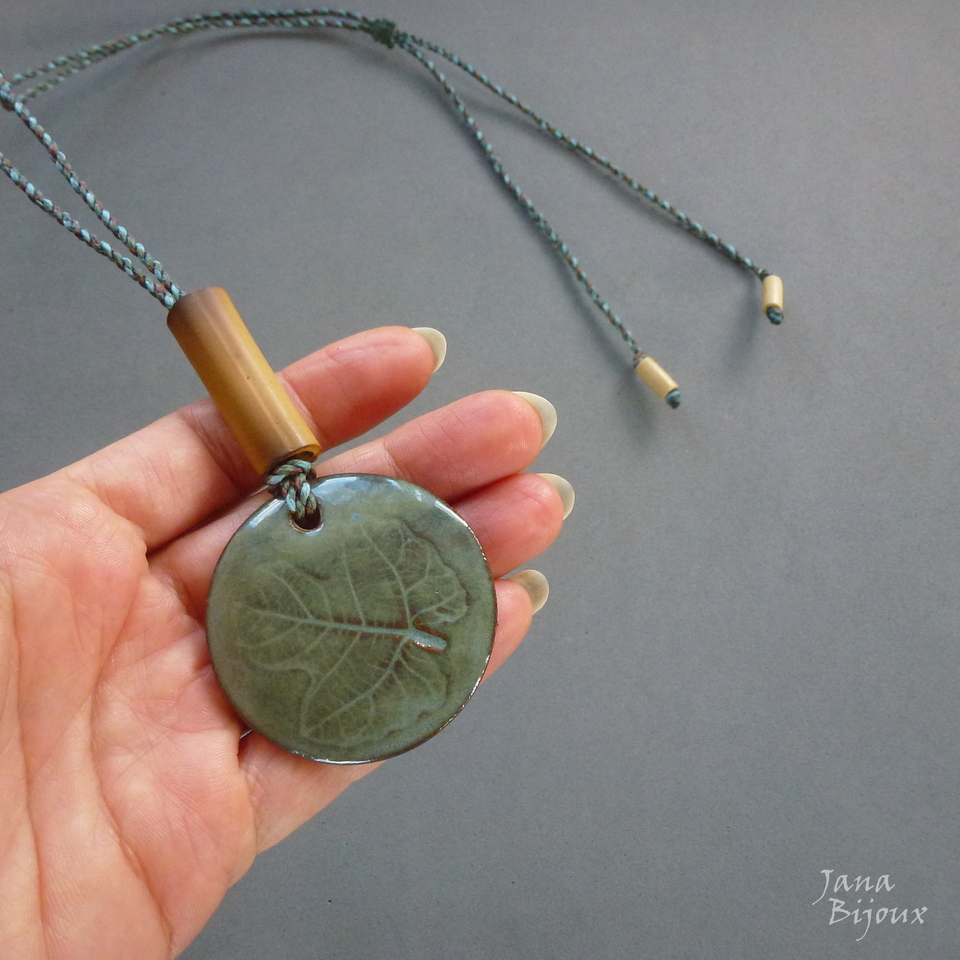 Cerâmica de alta temperatura, lindo desenho de folha, feita a mão 5 cm pela @luciane_schwarz . O cordão é tmb trabalho manual, feito de 3 cores (verde oliva, azul acinzentado claro e marrom chocolate) tem máx. de comprimento 90 cm, bambu, nas pontas contas de madeira, pode ser usado curto, médio ou comprido.