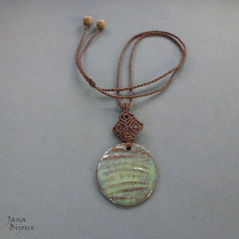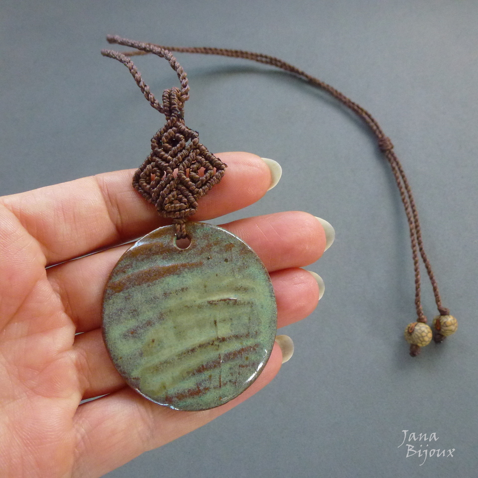 Colar com pingente menor e detalhe em macramé, a cerâmica feita a mão pela @luciane_schwarz,  tem 4,7 cm,  com macrame em cima dela pingente mede 8,5 cm. A cerâmica tem movimento livre no cordão .