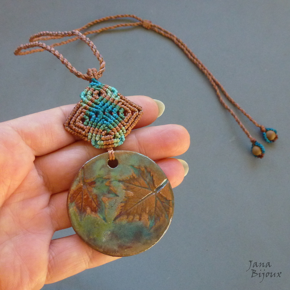 Cerâmica feita a mão pela @luciane_schwarz,  tem 4,7cm,  com macramé em cima dela pingente mede 9,3 cm. A cerâmica tem movimento livre no cordão .