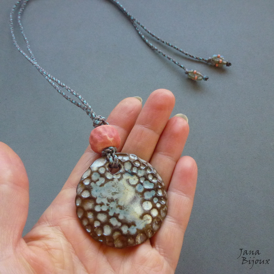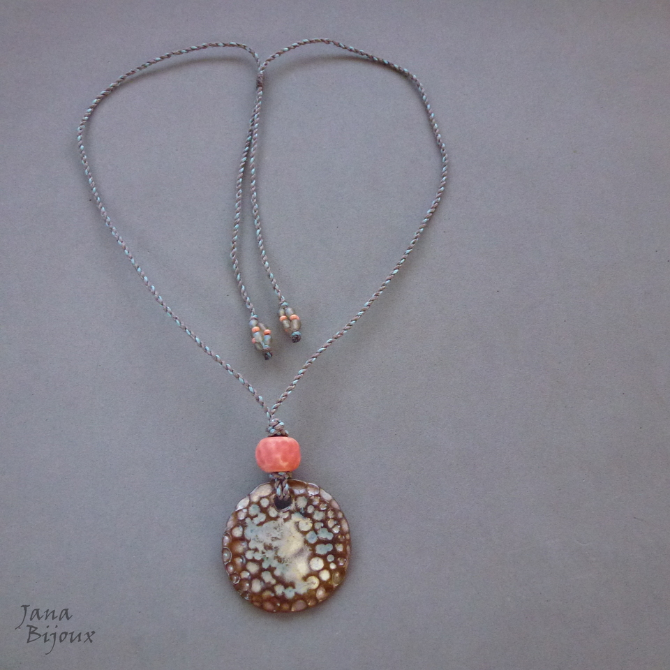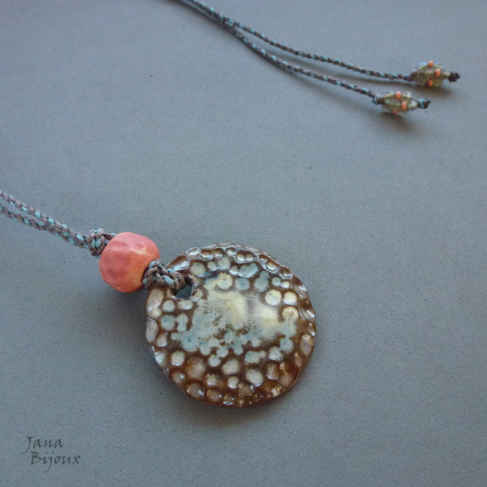 Colar simples, porém artesanal. Cerâmica de alta temperatura, feita a mão 4,7 cm. Nas pontas cristais coloridos em cima da cerâmica uma bola de cerâmica, comprimento ajustável, tem 86 cm, pode ser usado curto, médio ou comprido.